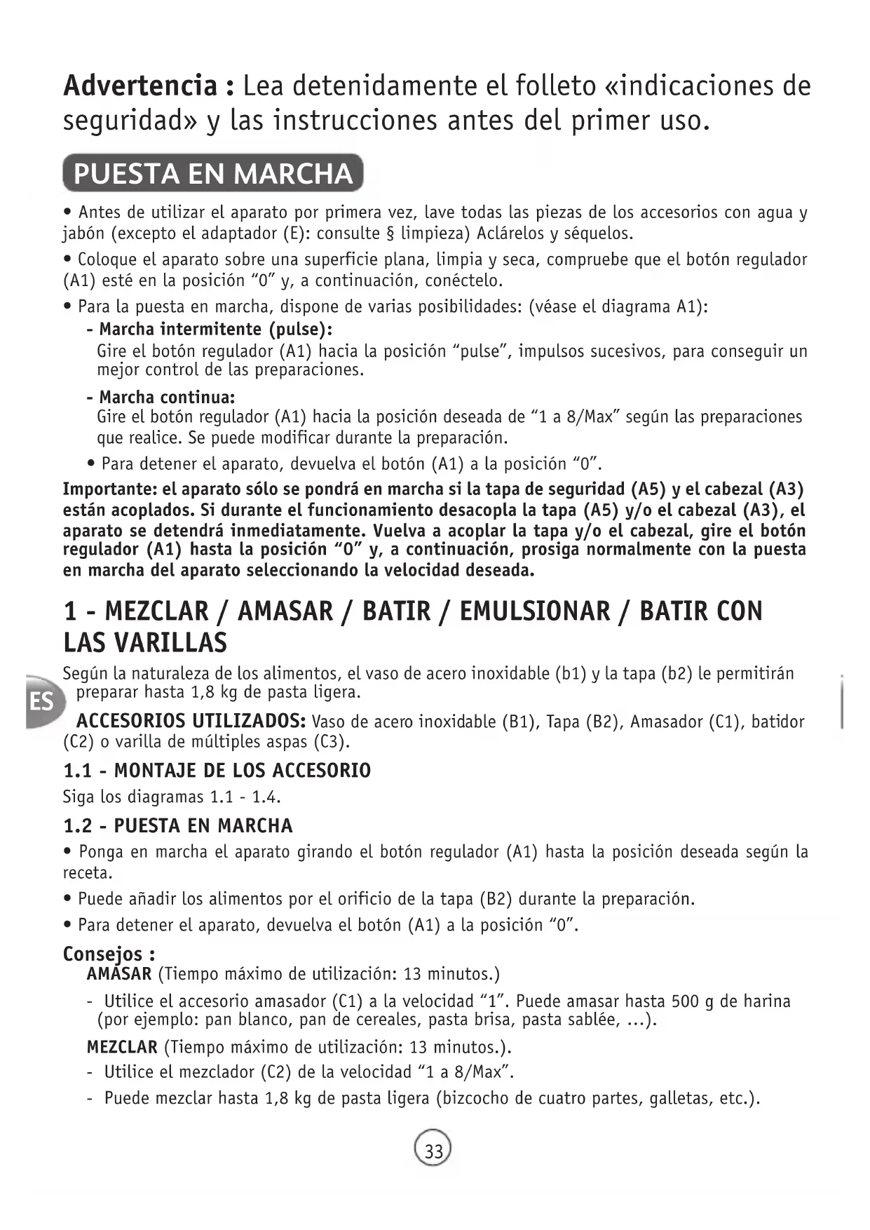 - Ponga en marcha el aparato girando el botón regulador (A1) hasta la posición deseada según la receta.• Puede añadir los alimentos por el orificio de la tapa (B2) durante la preparación.• Para detener el aparato, devuelva el botón (A1) a la posición “0”. Consejos : AMASAR (Tiempo máximo de utilización: 13 minutos.)- Utilice el accesorio amasador (C1) a la velocidad “1”. Puede amasar hasta 500 g de harina (por ejemplo: pan blanco, pan de cereales, pasta brisa, pasta sablée, …).MEZCLAR (Tiempo máximo de utilización: 13 minutos.).- Utilice el mezclador (C2) de la velocidad “1 a 8/Max”.- Puede mezclar hasta 1,8 kg de pasta ligera (bizcocho de cuatro partes, galletas, etc.).ES
