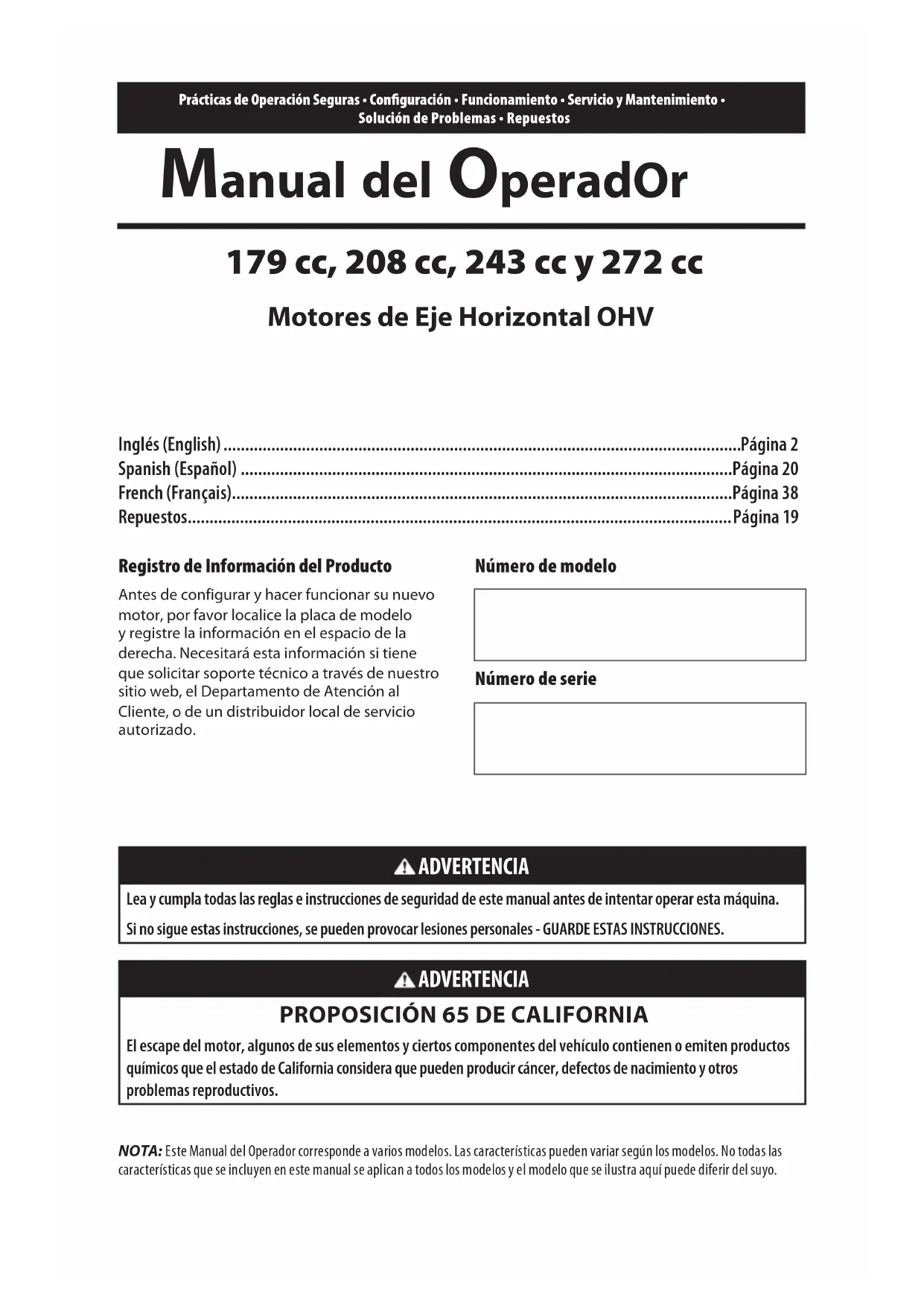 - Clé (si l’appareil en est équipé)Prácticas de Operación Seguras • Configuración • Funcionamiento • Servicio y Mantenimiento • Solución de Problemas • Repuestos Manual del OperadOr 179 cc, 208 cc, 243 cc y 272 cc Motores de Eje Horizontal OHV NOTA: Este Manual del Operador corresponde a varios modelos. Las características pueden variar según los modelos. No todas las características que se incluyen en este manual se aplican a todos los modelos y el modelo que se ilustra aquí puede diferir del suyo. ADVERTENCIA Lea y cumpla todas las reglas e instrucciones de seguridad de este manual antes de intentar operar esta máquina. Si no sigue estas instrucciones, se pueden provocar lesiones personales - GUARDE ESTAS INSTRUCCIONES. ADVERTENCIA