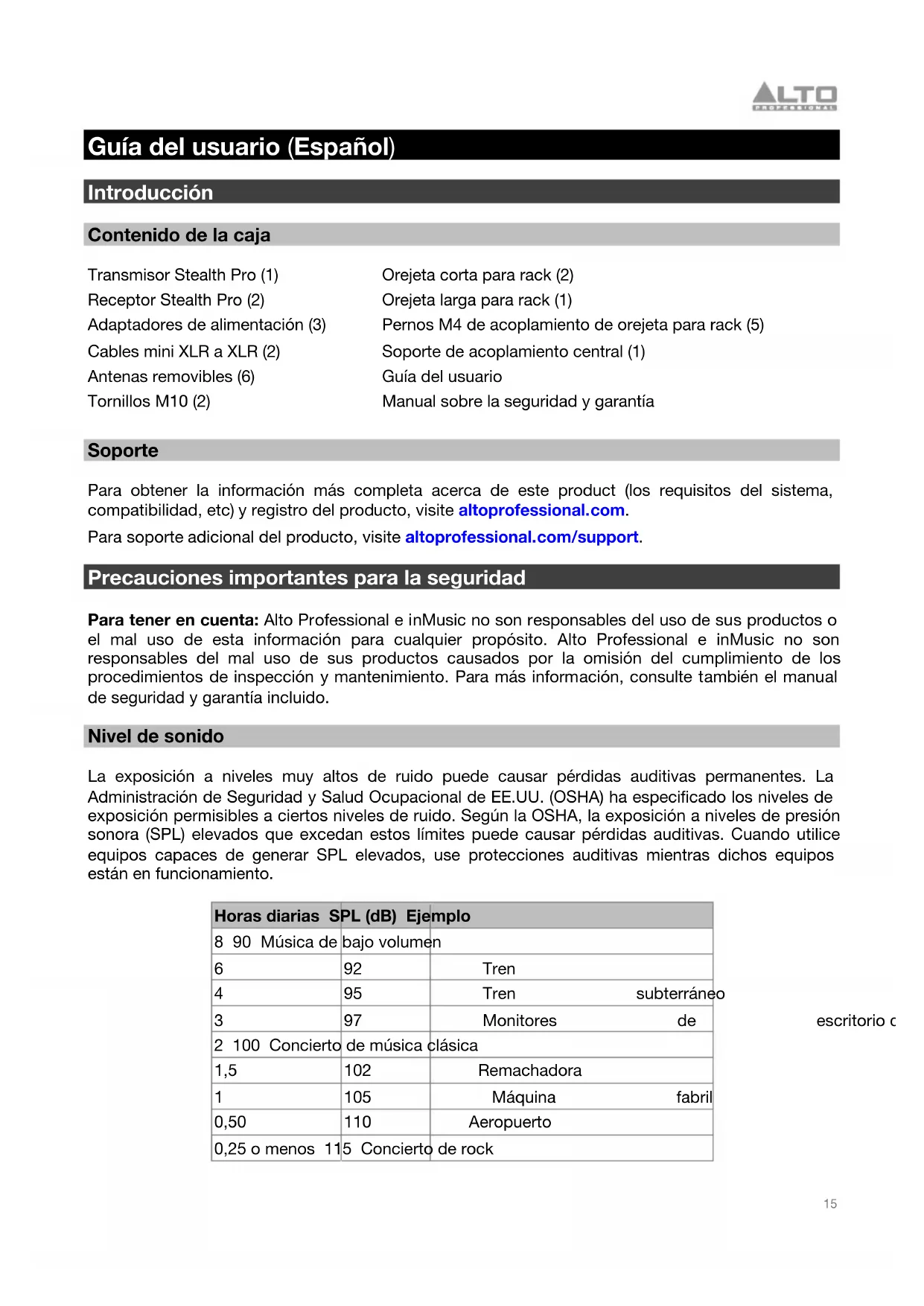 Guía del usuario (Español) Introducción Contenido de la caja Transmisor Stealth Pro (1) Receptor Stealth Pro (2) Adaptadores de alimentación (3) Cables mini XLR a XLR (2) Antenas removibles (6) Tornillos M10 (2) Orejeta corta para rack (2) Orejeta larga para rack (1) Pernos M4 de acoplamiento de orejeta para rack (5) Soporte de acoplamiento central (1) Guía del usuario Manual sobre la seguridad y garantía Soporte Para obtener la información más completa acerca de este product (los requisitos del sistema, compatibilidad, etc) y registro del producto, visite altoprofessional.com. Para soporte adicional del producto, visite altoprofessional.com/support. Precauciones importantes para la seguridad Para tener en cuenta: Alto Professional e inMusic no son responsables del uso de sus productos o el mal uso de esta información para cualquier propósito. Alto Professional e inMusic no son responsables del mal uso de sus productos causados por la omisión del cumplimiento de los procedimientos de inspección y mantenimiento. Para más información, consulte también el manual de seguridad y garantía incluido. Nivel de sonido La exposición a niveles muy altos de ruido puede causar pérdidas auditivas permanentes. La Administración de Seguridad y Salud Ocupacional de EE.UU. (OSHA) ha especificado los niveles de exposición permisibles a ciertos niveles de ruido. Según la OSHA, la exposición a niveles de presión sonora (SPL) elevados que excedan estos límites puede causar pérdidas auditivas. Cuando utilice equipos capaces de generar SPL elevados, use protecciones auditivas mientras dichos equipos están en funcionamiento. Horas diarias SPL (dB) Ejemplo 8 90 Música de bajo volumen 6 92 Tren 4 95 Tren subterráneo 3 97 Monitores de escritorio de alto nivel 2 100 Concierto de música clásica 1,5 102 Remachadora 1 105 Máquina fabril 0,50 110 Aeropuerto 0,25 o menos 115 Concierto de rock16