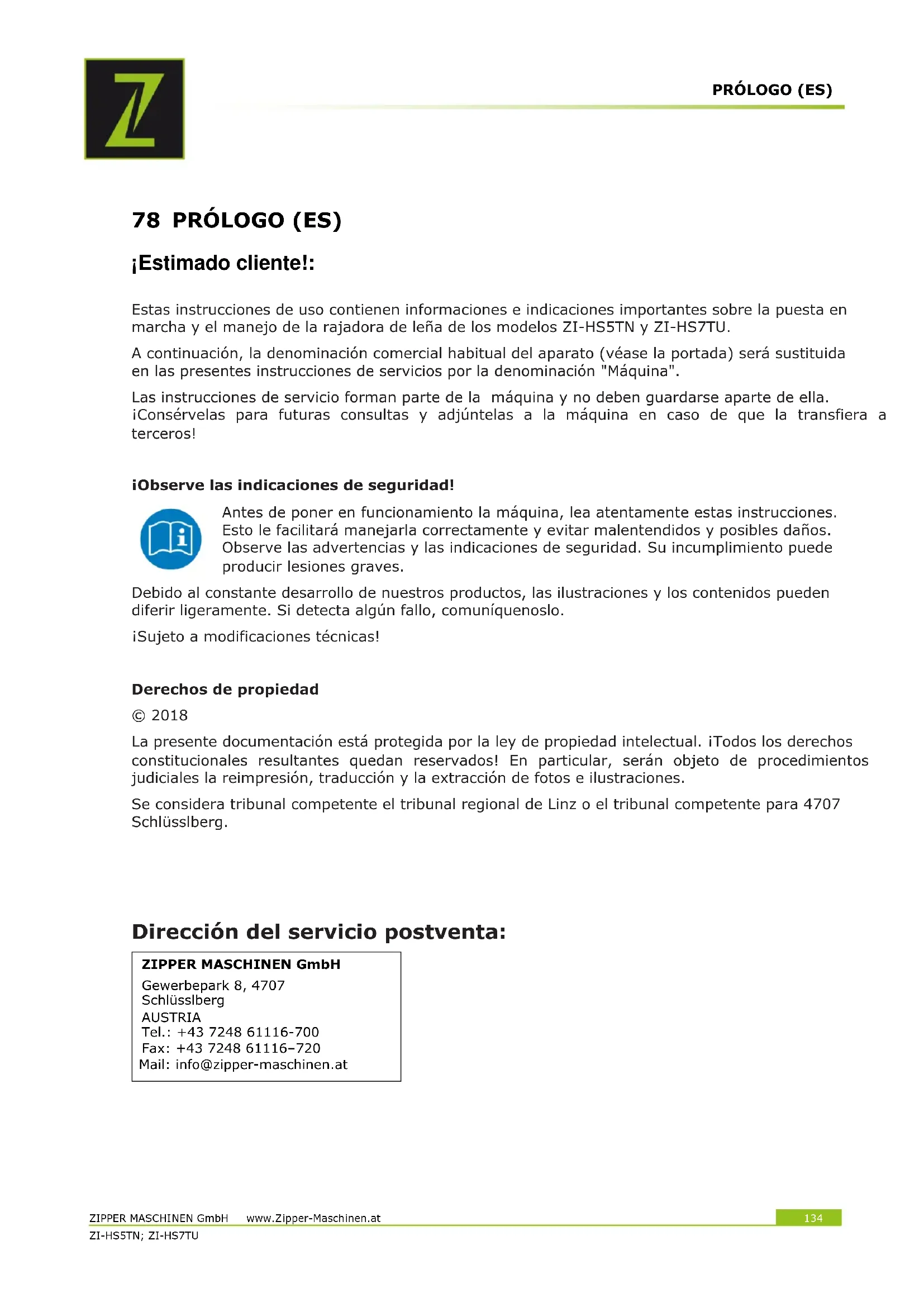 Antes de poner en funcionamiento la máquina, lea atentamente estas instrucciones. Esto le facilitará manejarla correctamente y evitar malentendidos y posibles daños. Observe las advertencias y las indicaciones de seguridad. Su incumplimiento puede producir lesiones graves. Debido al constante desarrollo de nuestros productos, las ilustraciones y los contenidos pueden diferir ligeramente. Si detecta algún fallo, comuníquenoslo. ¡Sujeto a modificaciones técnicas! Derechos de propiedad © 2018 La presente documentación está protegida por la ley de propiedad intelectual. ¡Todos los derechos constitucionales resultantes quedan reservados! En particular, serán objeto de procedimientos judiciales la reimpresión, traducción y la extracción de fotos e ilustraciones. Se considera tribunal competente el tribunal regional de Linz o el tribunal competente para 4707 Schlüsslberg.