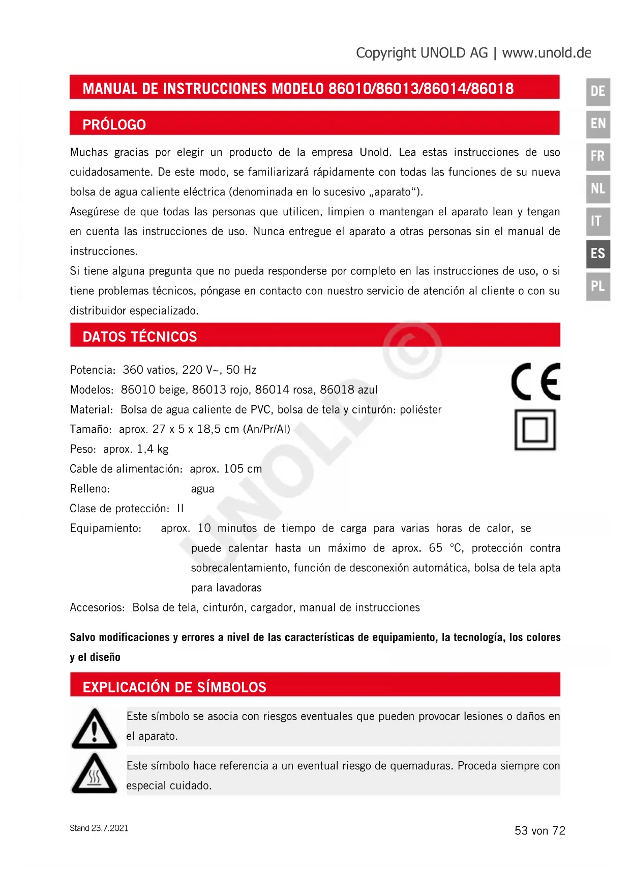 Este símbolo se asocia con riesgos eventuales que pueden provocar lesiones o daños en el aparato. Este símbolo hace referencia a un eventual riesgo de quemaduras. Proceda siempre con especial cuidado. PRÓLOGO Muchas gracias por elegir un producto de la empresa Unold. Lea estas instrucciones de uso cuidadosamente. De este modo, se familiarizará rápidamente con todas las funciones de su nueva bolsa de agua caliente eléctrica (denominada en lo sucesivo „aparato“). Asegúrese de que todas las personas que utilicen, limpien o mantengan el aparato lean y tengan en cuenta las instrucciones de uso. Nunca entregue el aparato a otras personas sin el manual de instrucciones. Si tiene alguna pregunta que no pueda responderse por completo en las instrucciones de uso, o si tiene problemas técnicos, póngase en contacto con nuestro servicio de atención al cliente o con su distribuidor especializado. Copyright UNOLD AG | www.unold.de UNOLD ©54 von 72 Stand 23.7.2021