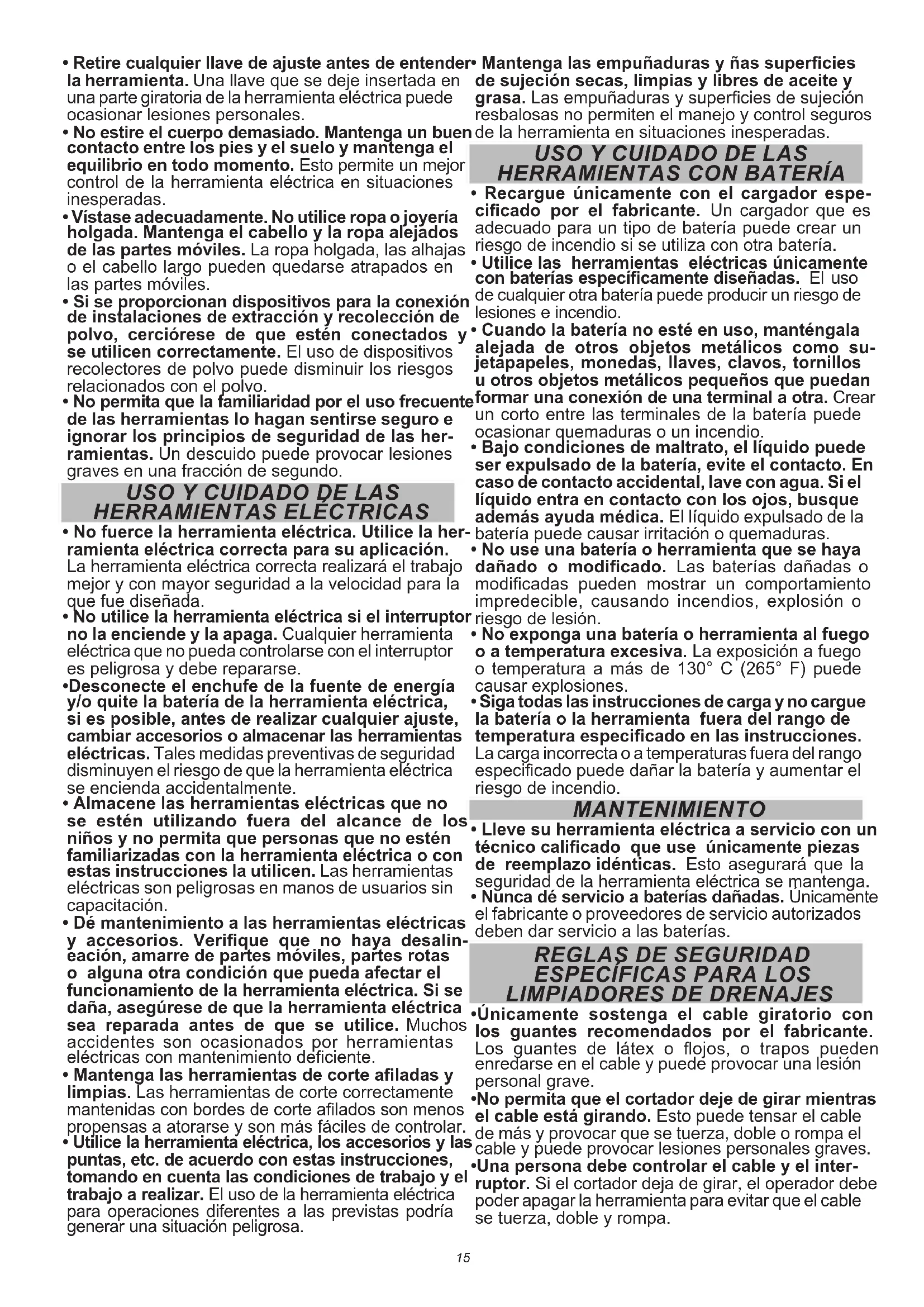 con rmeza. ADVERTENCIA Para reducir el riesgo de le- siones, descarga eléctrica o daño a la herramienta, nunca la sumerja en líqui- dos ni permita que estos uyan dentro de la misma. Limpieza Limpie el polvo y suciedad de las ventilas. Man- tenga los mangos limpios, secos y libres de aceite o grasa. Use solo jabón neutro y un trapo húmedo para limpiar, ya que algunos substancias y solventes limpiadores son dañinos a los plásticos y partes aislantes. Algunos de estos incluyen: gasolina, turpentina,thíner, lacas, thíner para pinturas, solven- tes para limpieza con cloro, amoníaco y detergentes caseros que tengan amonia. Nunca usa solventes in- amables o combustibles cerca de una herramienta. Limpieza de cables, tubo y máquina El cable y el tubo deben enjuagarse minuciosamente con agua después de haberlos usado cada vez, esto con el n de evitar los efectos dañinos de los sedi- mentos y los compuestos de limpieza de drenajes. ¡ADVERTENCIA! Siempre utilice guantes de cuero sobre el látex o guantes de goma para evitar el enredo. Después del lavado, seque el cable y el tubo por completo. Posteriormente, limpie el cable con un trapo con aceite antes de regresarlo al transportador. Procedimiento de limpieza: