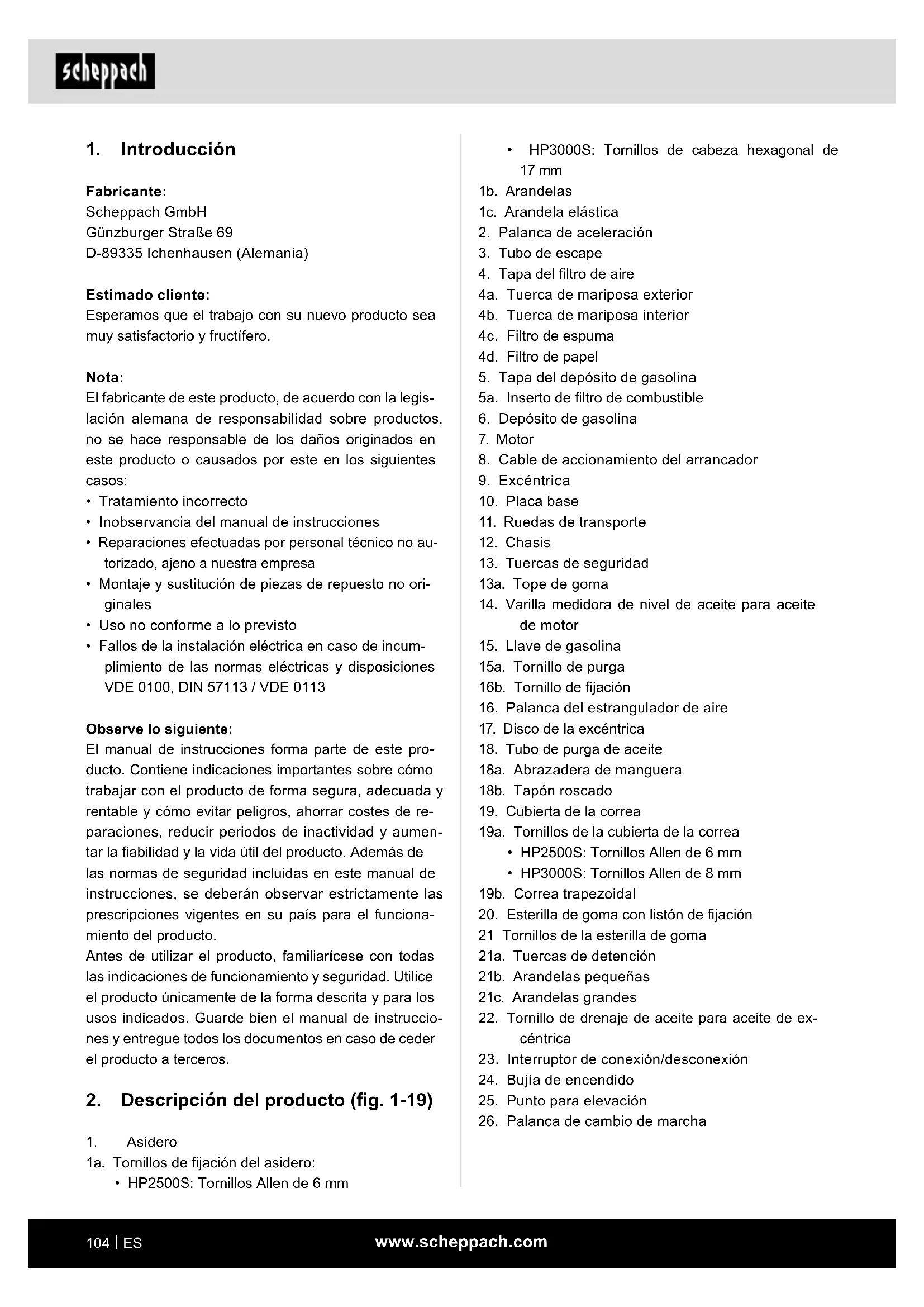 Fabricante: Scheppach GmbH Günzburger Straße 69 D-89335 Ichenhausen (Alemania) Estimado cliente: Esperamos que el trabajo con su nuevo producto sea muy satisfactorio y fructífero. Nota: El fabricante de este producto, de acuerdo con la legis- lación alemana de responsabilidad sobre productos, no se hace responsable de los daños originados en este producto o causados por este en los siguientes casos: