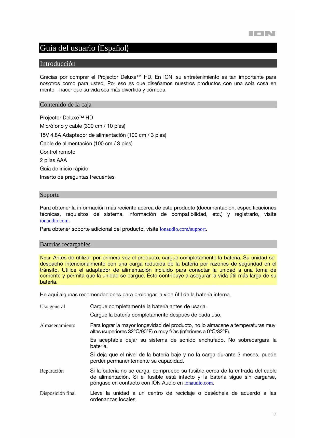 - Connect your device's headphone output to the 1/8" (3.5 mm) aux input on the projector, or if your device supports Bluetooth, connect your device to the projector via Bluetooth. How do I resolve the HDCP error message? Be sure to use at least an HDMI 2.0 cable. (1) Disconnect the HDMI cable from both devices (2) Disconnect the power cables (3) Reconnect the HDMI cables (4) Reconnect the power cables and power on devices. On some devices, you will have the ability to change the display setting from 4k to 720p which may also help resolve this issue.17 Guía del usuario (Español) Introducción Gracias por comprar el Projector Deluxe™ HD. En ION, su entretenimiento es tan importante para nosotros como para usted. Por eso es que diseñamos nuestros productos con una sola cosa en mente—hacer que su vida sea más divertida y cómoda. Contenido de la caja Projector Deluxe™ HD Micrófono y cable (300 cm / 10 pies) 15V 4.8A Adaptador de alimentación (100 cm / 3 pies) Cable de alimentación (100 cm / 3 pies) Control remoto 2 pilas AAA Guía de inicio rápido Inserto de preguntas frecuentes Soporte Para obtener la información más reciente acerca de este producto (documentación, especificaciones técnicas, requisitos de sistema, información de compatibilidad, etc.) y registrarlo, visite ionaudio.com. Para obtener soporte adicional del producto, visite ionaudio.com/support. Baterías recargables Nota: Antes de utilizar por primera vez el producto, cargue completamente la batería. Su unidad se despachó intencionalmente con una carga reducida de la batería por razones de seguridad en el tránsito. Utilice el adaptador de alimentación incluido para conectar la unidad a una toma de corriente y permita que la unidad se cargue. Esto contribuye a asegurar la vida útil más larga de su batería. He aquí algunas recomendaciones para prolongar la vida útil de la batería interna. Uso general Cargue completamente la batería antes de usarla. Cargue la batería completamente después de cada uso.