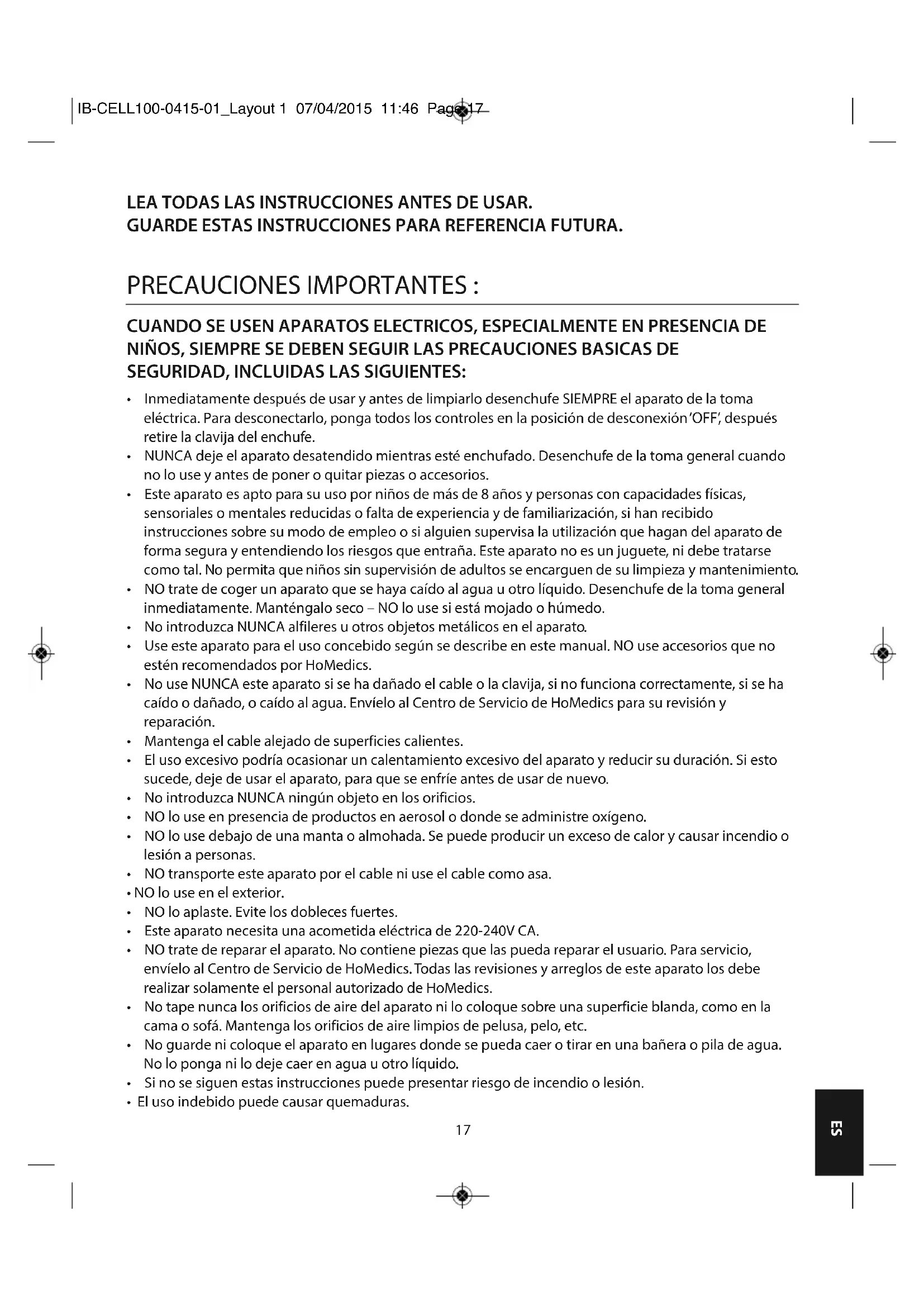 - Nunca utilice limpiadores abrasivos, cepillos, limpiavidrios/lustramuebles, diluyente para pintura, etc. para limpiarlo. Almacén Coloque el aparato en su caja, en un lugar fresco, seco y seguro. Para evitar roturas, NO enrolle el cable alrededor del aparato. NO cuelgue la unidad por el cable. IB-CELL100-0415-01_Layout 1 07/04/2015 11:46 Page 2122