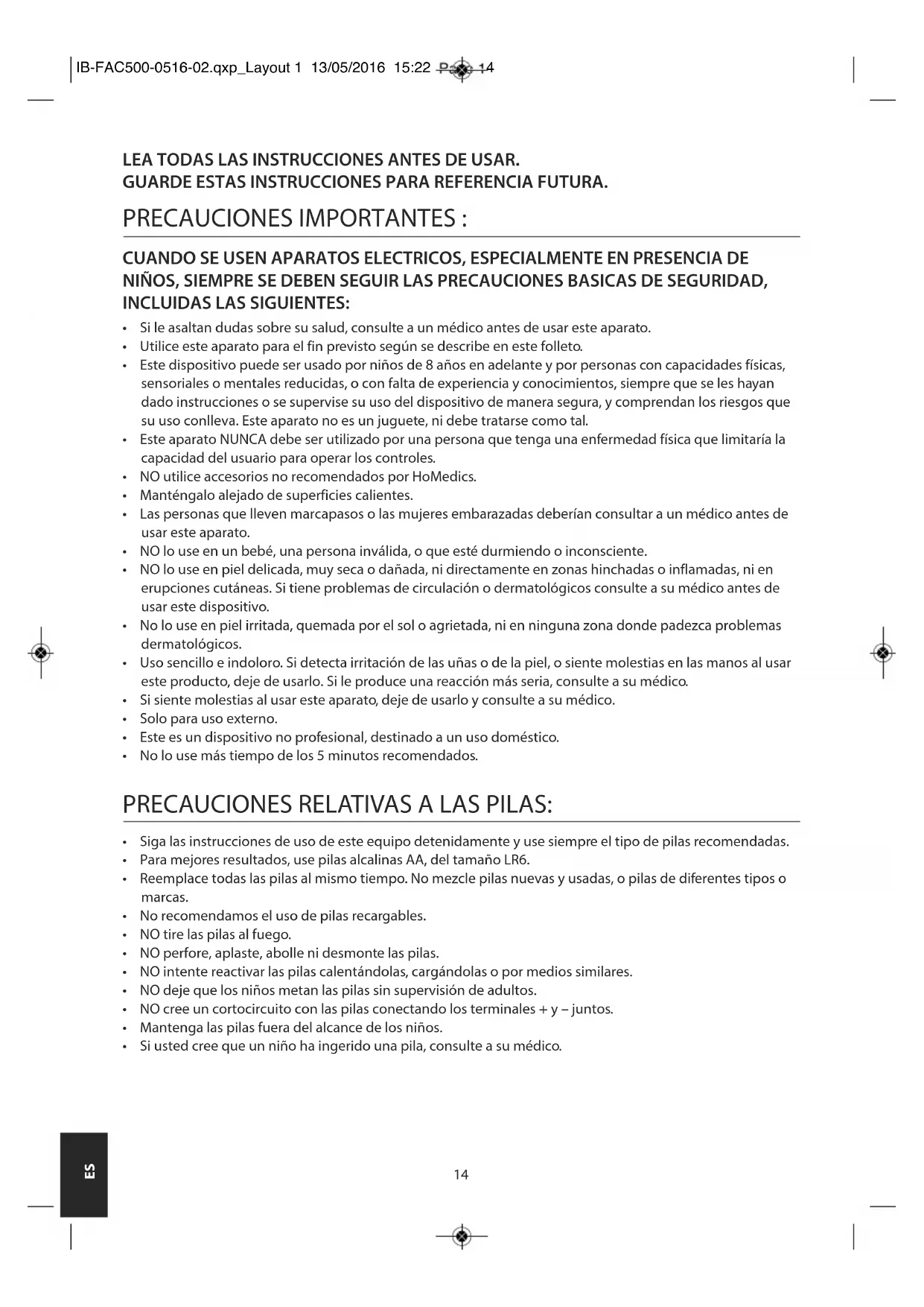 - Si usted cree que un niño ha ingerido una pila, consulte a su médico. IB-FAC500-0516-02.qxp_Layout 1 13/05/2016 15:22 Page 1415