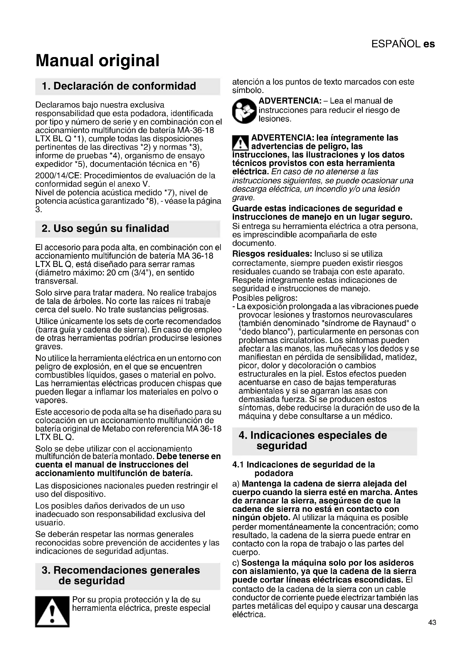 El accesorio para poda alta, en combinación con el accionamiento multifunción de batería MA 36-18 LTX BL Q, está diseñado para serrar ramas (diámetro máximo: 20 cm (3/4"), en sentido transversal. Solo sirve para tratar madera. No realice trabajos de tala de árboles. No corte las raíces ni trabaje cerca del suelo. No trate sustancias peligrosas. Utilice únicamente los sets de corte recomendados (barra guía y cadena de sierra). En caso de empleo de otras herramientas podrían producirse lesiones graves. No utilice la herramienta eléctrica en un entorno con peligro de explosión, en el que se encuentren combustibles líquidos, gases o material en polvo. Las herramientas eléctricas producen chispas que pueden llegar a inflamar los materiales en polvo o vapores. Este accesorio de poda alta se ha diseñado para su colocación en un accionamiento multifunción de batería original de Metabo con referencia MA 36-18 LTX BL Q. Solo se debe utilizar con el accionamiento multifunción de batería montado. Debe tenerse en cuenta el manual de instrucciones del accionamiento multifunción de batería. Las disposiciones nacionales pueden restringir el uso del dispositivo. Los posibles daños derivados de un uso inadecuado son responsabilidad exclusiva del usuario. Se deberán respetar las normas generales reconocidas sobre prevención de accidentes y las indicaciones de seguridad adjuntas. Por su propia protección y la de su herramienta eléctrica, preste especial atención a los puntos de texto marcados con este símbolo. ADVERTENCIA: – Lea el manual de instrucciones para reducir el riesgo de lesiones. ADVERTENCIA: lea íntegramente las advertencias de peligro, las instrucciones, las ilustraciones y los datos técnicos provistos con esta herramienta eléctrica. En caso de no atenerse a las instrucciones siguientes, se puede ocasionar una descarga eléctrica, un incendio y/o una lesión grave. Guarde estas indicaciones de seguridad e instrucciones de manejo en un lugar seguro. Si entrega su herramienta eléctrica a otra persona, es imprescindible acompañarla de este documento. Riesgos residuales: Incluso si se utiliza correctamente, siempre pueden existir riesgos residuales cuando se trabaja con este aparato. Respete íntegramente estas indicaciones de seguridad e instrucciones de manejo. Posibles peligros: - La exposición prolongada a las vibraciones puede provocar lesiones y trastornos neurovasculares (también denominado "síndrome de Raynaud" o "dedo blanco"), particularmente en personas con problemas circulatorios. Los síntomas pueden afectar a las manos, las muñecas y los dedos y se manifiestan en pérdida de sensibilidad, matidez, picor, dolor y decoloración o cambios estructurales en la piel. Estos efectos pueden acentuarse en caso de bajas temperaturas ambientales y si se agarran las asas con demasiada fuerza. Si se producen estos síntomas, debe reducirse la duración de uso de la máquina y debe consultarse a un médico.