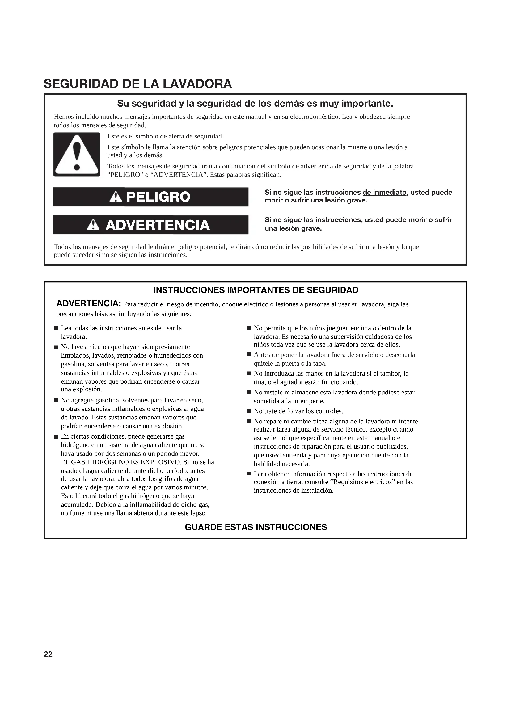 Lea todas las instrucciones antes de usar la lavadora. No lave artículos que hayan sido previamente limpiados, lavados, remojados o humedecidos con gasolina, solventes para lavar en seco, u otras sustancias inflamables o explosivas ya que éstas emanan vapores que podrían encenderse o causar una explosión. No agregue gasolina, solventes para lavar en seco, u otras sustancias inflamables o explosivas al agua de lavado. Estas sustancias emanan vapores que podrían encenderse o causar una explosión. En ciertas condiciones, puede generarse gas hidrógeno en un sistema de agua caliente que no se haya usado por dos semanas o un período mayor. EL GAS HIDRÓGENO ES EXPLOSIVO. Si no se ha usado el agua caliente durante dicho período, antes de usar la lavadora, abra todos los grifos de agua caliente y deje que corra el agua por varios minutos. Esto liberará todo el gas hidrógeno que se haya acumulado. Debido a la inflamabilidad de dicho gas, no fume ni use una llama abierta durante este lapso. No permita que los niños jueguen encima o dentro de la lavadora. Es necesario una supervisión cuidadosa de los niños toda vez que se use la lavadora cerca de ellos. Antes de poner la lavadora fuera de servicio o desecharla, quítele la puerta o la tapa. No introduzca las manos en la lavadora si el tambor, la tina, o el agitador están funcionando. No instale ni almacene esta lavadora donde pudiese estar sometida a la intemperie. No trate de forzar los controles. No repare ni cambie pieza alguna de la lavadora ni intente realizar tarea alguna de servicio técnico, excepto cuando así se le indique específicamente en este manual o en instrucciones de reparación para el usuario publicadas, que usted entienda y para cuya ejecución cuente con la habilidad necesaria. Para obtener información respecto a las instrucciones de conexión a tierra, consulte “Requisitos eléctricos” en las instrucciones de instalación. ADVERTENCIA: Para reducir el riesgo de incendio, choque eléctrico o lesiones a personas al usar su lavadora, siga las precauciones básicas, incluyendo las siguientes:Si no sigue las instrucciones de inmediato, usted puede morir o sufrir una lesión grave.Si no sigue las instrucciones, usted puede morir o sufrir una lesión grave. Todos los mensajes de seguridad le dirán el peligro potencial, le dirán cómo reducir las posibilidades de sufrir una lesión y lo que puede suceder si no se siguen las instrucciones. Su seguridad y la seguridad de los demás es muy importante. Hemos incluido muchos mensajes importantes de seguridad en este manual y en su electrodoméstico. Lea y obedezca siempre todos los mensajes de seguridad. ADVERTENCIA PELIGRO Este es el símbolo de alerta de seguridad.Este símbolo le llama la atención sobre peligros potenciales que pueden ocasionar la muerte o una lesión a usted y a los demás.Todos los mensajes de seguridad irán a continuación del símbolo de advertencia de seguridad y de la palabra “PELIGRO” o “ADVERTENCIA”. Estas palabras significan:23