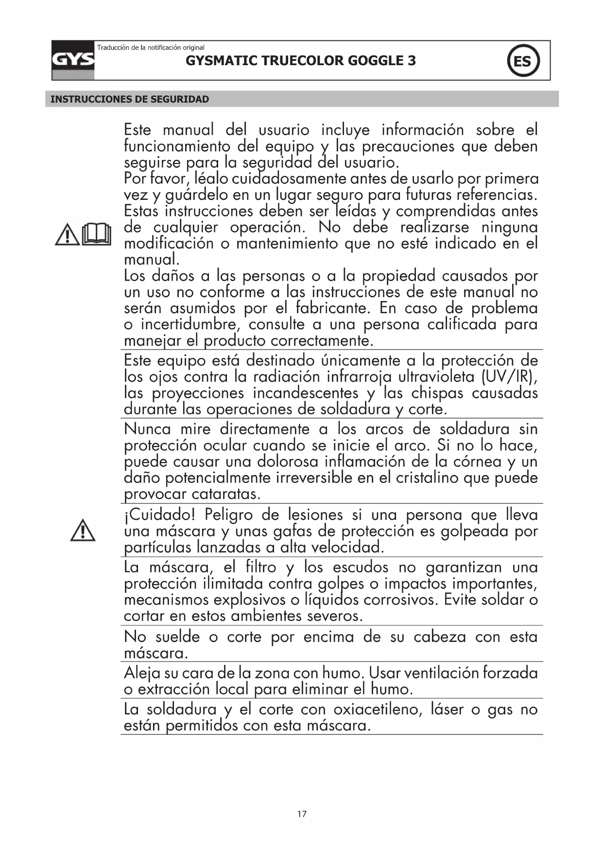Este manual del usuario incluye información sobre el funcionamiento del equipo y las precauciones que deben seguirse para la seguridad del usuario. Por favor, léalo cuidadosamente antes de usarlo por primera vez y guárdelo en un lugar seguro para futuras referencias. Estas instrucciones deben ser leídas y comprendidas antes de cualquier operación. No debe realizarse ninguna modificación o mantenimiento que no esté indicado en el manual. Los daños a las personas o a la propiedad causados por un uso no conforme a las instrucciones de este manual no serán asumidos por el fabricante. En caso de problema o incertidumbre, consulte a una persona calificada para manejar el producto correctamente. Este equipo está destinado únicamente a la protección de los ojos contra la radiación infrarroja ultravioleta (UV/IR), las proyecciones incandescentes y las chispas causadas durante las operaciones de soldadura y corte. Nunca mire directamente a los arcos de soldadura sin protección ocular cuando se inicie el arco. Si no lo hace, puede causar una dolorosa inflamación de la córnea y un daño potencialmente irreversible en el cristalino que puede provocar cataratas. ¡Cuidado! Peligro de lesiones si una persona que lleva una máscara y unas gafas de protección es golpeada por partículas lanzadas a alta velocidad. La máscara, el filtro y los escudos no garantizan una protección ilimitada contra golpes o impactos importantes, mecanismos explosivos o líquidos corrosivos. Evite soldar o cortar en estos ambientes severos. No suelde o corte por encima de su cabeza con esta máscara. Aleja su cara de la zona con humo. Usar ventilación forzada o extracción local para eliminar el humo. La soldadura y el corte con oxiacetileno, láser o gas no están permitidos con esta máscara.GYSMATIC TRUECOLOR GOGGLE 3