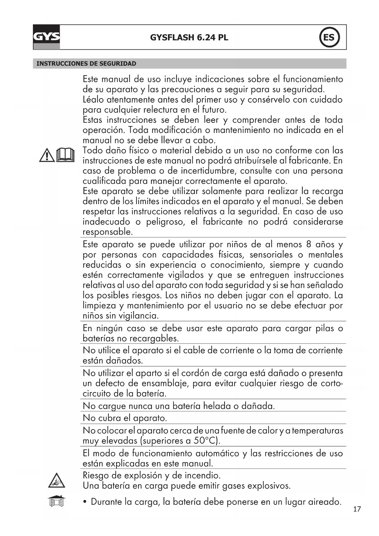- Durante la carga, la batería debe ponerse en un lugar aireado.18 GYSFLASH 6.24 PL