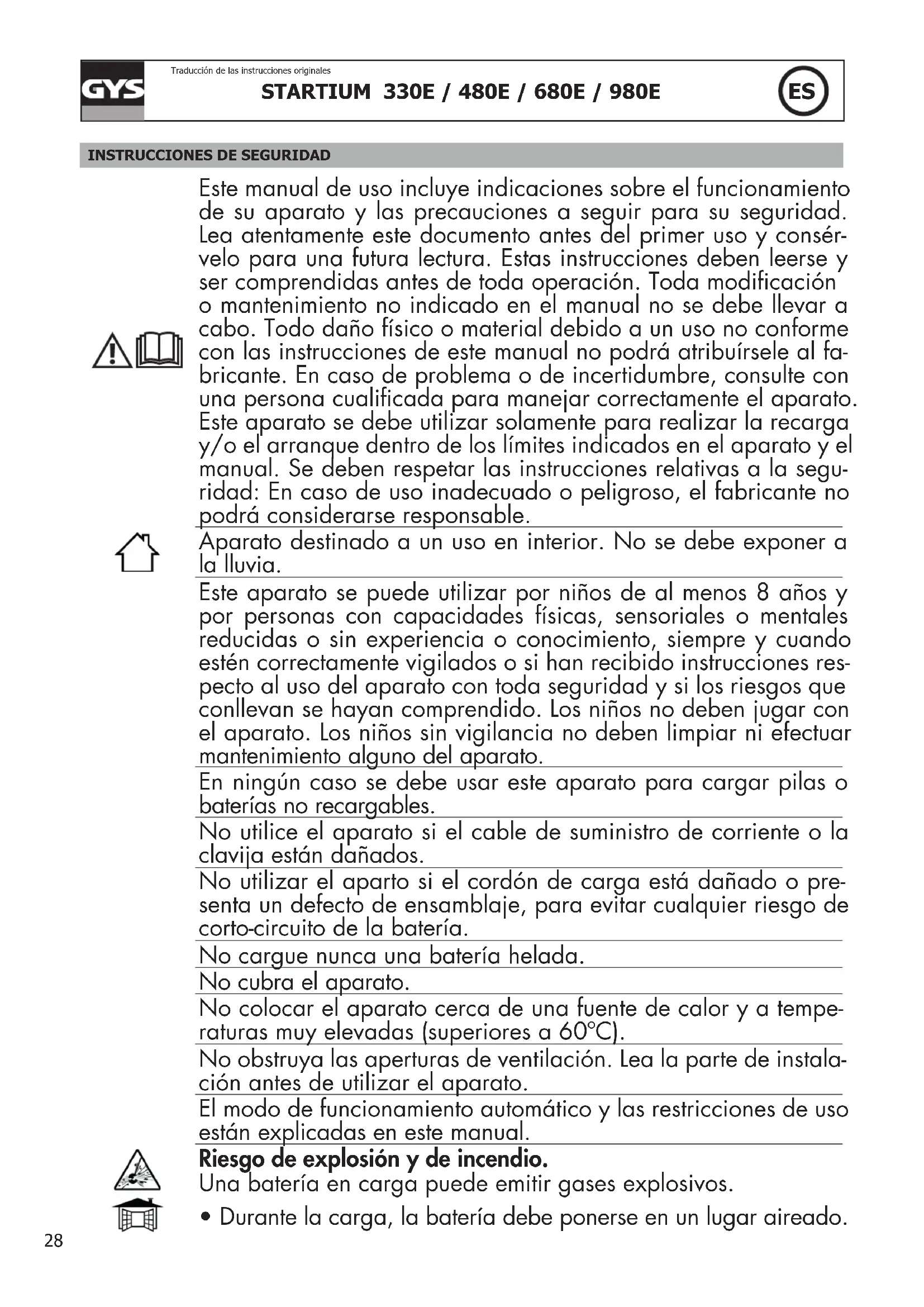 Este manual de uso incluye indicaciones sobre el funcionamiento de su aparato y las precauciones a seguir para su seguridad. Lea atentamente este documento antes del primer uso y consér- velo para una futura lectura. Estas instrucciones deben leerse y ser comprendidas antes de toda operación. Toda modicación o mantenimiento no indicado en el manual no se debe llevar a cabo. Todo daño físico o material debido a un uso no conforme con las instrucciones de este manual no podrá atribuírsele al fa- bricante. En caso de problema o de incertidumbre, consulte con una persona cualicada para manejar correctamente el aparato. Este aparato se debe utilizar solamente para realizar la recarga y/o el arranque dentro de los límites indicados en el aparato y el manual. Se deben respetar las instrucciones relativas a la segu- ridad: En caso de uso inadecuado o peligroso, el fabricante no podrá considerarse responsable. Aparato destinado a un uso en interior. No se debe exponer a la lluvia. Este aparato se puede utilizar por niños de al menos 8 años y por personas con capacidades físicas, sensoriales o mentales reducidas o sin experiencia o conocimiento, siempre y cuando estén correctamente vigilados o si han recibido instrucciones res- pecto al uso del aparato con toda seguridad y si los riesgos que conllevan se hayan comprendido. Los niños no deben jugar con el aparato. Los niños sin vigilancia no deben limpiar ni efectuar mantenimiento alguno del aparato. En ningún caso se debe usar este aparato para cargar pilas o baterías no recargables. No utilice el aparato si el cable de suministro de corriente o la clavija están dañados. No utilizar el aparto si el cordón de carga está dañado o pre- senta un defecto de ensamblaje, para evitar cualquier riesgo de corto-circuito de la batería. No cargue nunca una batería helada. No cubra el aparato. No colocar el aparato cerca de una fuente de calor y a tempe- raturas muy elevadas (superiores a 60ºC). No obstruya las aperturas de ventilación. Lea la parte de instala- ción antes de utilizar el aparato. El modo de funcionamiento automático y las restricciones de uso están explicadas en este manual. Riesgo de explosión y de incendio. Una batería en carga puede emitir gases explosivos.