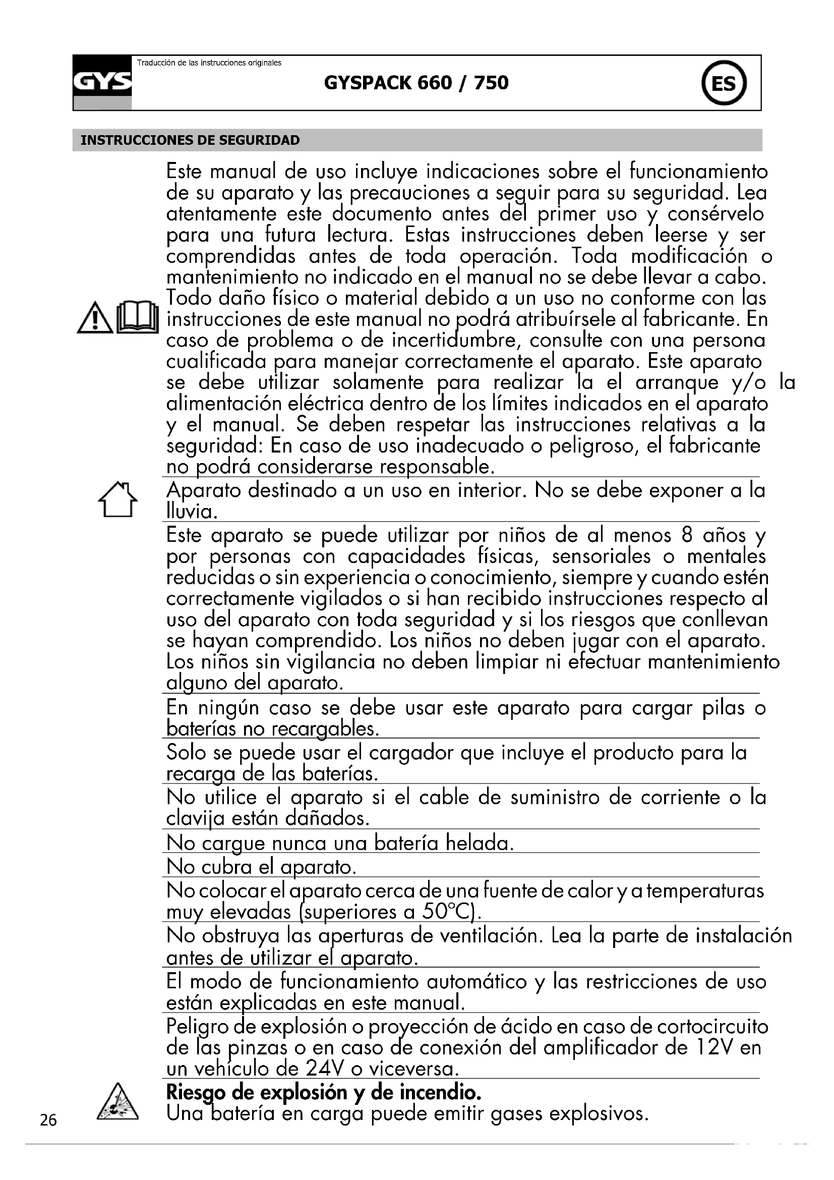 Este manual de uso incluye indicaciones sobre el funcionamiento de su aparato y las precauciones a seguir para su seguridad. Lea atentamente este documento antes del primer uso y consérvelo para una futura lectura. Estas instrucciones deben leerse y ser comprendidas antes de toda operación. Toda modicación o mantenimiento no indicado en el manual no se debe llevar a cabo. Todo daño físico o material debido a un uso no conforme con las instrucciones de este manual no podrá atribuírsele al fabricante. En caso de problema o de incertidumbre, consulte con una persona cualicada para manejar correctamente el aparato. Este aparato se debe utilizar solamente para realizar la el arranque y/o la alimentación eléctrica dentro de los límites indicados en el aparato y el manual. Se deben respetar las instrucciones relativas a la seguridad: En caso de uso inadecuado o peligroso, el fabricante no podrá considerarse responsable. Aparato destinado a un uso en interior. No se debe exponer a la lluvia. Este aparato se puede utilizar por niños de al menos 8 años y por personas con capacidades físicas, sensoriales o mentales reducidas o sin experiencia o conocimiento, siempre y cuando estén correctamente vigilados o si han recibido instrucciones respecto al uso del aparato con toda seguridad y si los riesgos que conllevan se hayan comprendido. Los niños no deben jugar con el aparato. Los niños sin vigilancia no deben limpiar ni efectuar mantenimiento alguno del aparato. En ningún caso se debe usar este aparato para cargar pilas o baterías no recargables. Solo se puede usar el cargador que incluye el producto para la recarga de las baterías. No utilice el aparato si el cable de suministro de corriente o la clavija están dañados. No cargue nunca una batería helada. No cubra el aparato. No colocar el aparato cerca de una fuente de calor y a temperaturas muy elevadas (superiores a 50ºC). No obstruya las aperturas de ventilación. Lea la parte de instalación antes de utilizar el aparato. El modo de funcionamiento automático y las restricciones de uso están explicadas en este manual. Peligro de explosión o proyección de ácido en caso de cortocircuito de las pinzas o en caso de conexión del amplicador de 12V en un vehículo de 24V o viceversa. Riesgo de explosión y de incendio. Una batería en carga puede emitir gases explosivos.GYSPACK 660 / 750