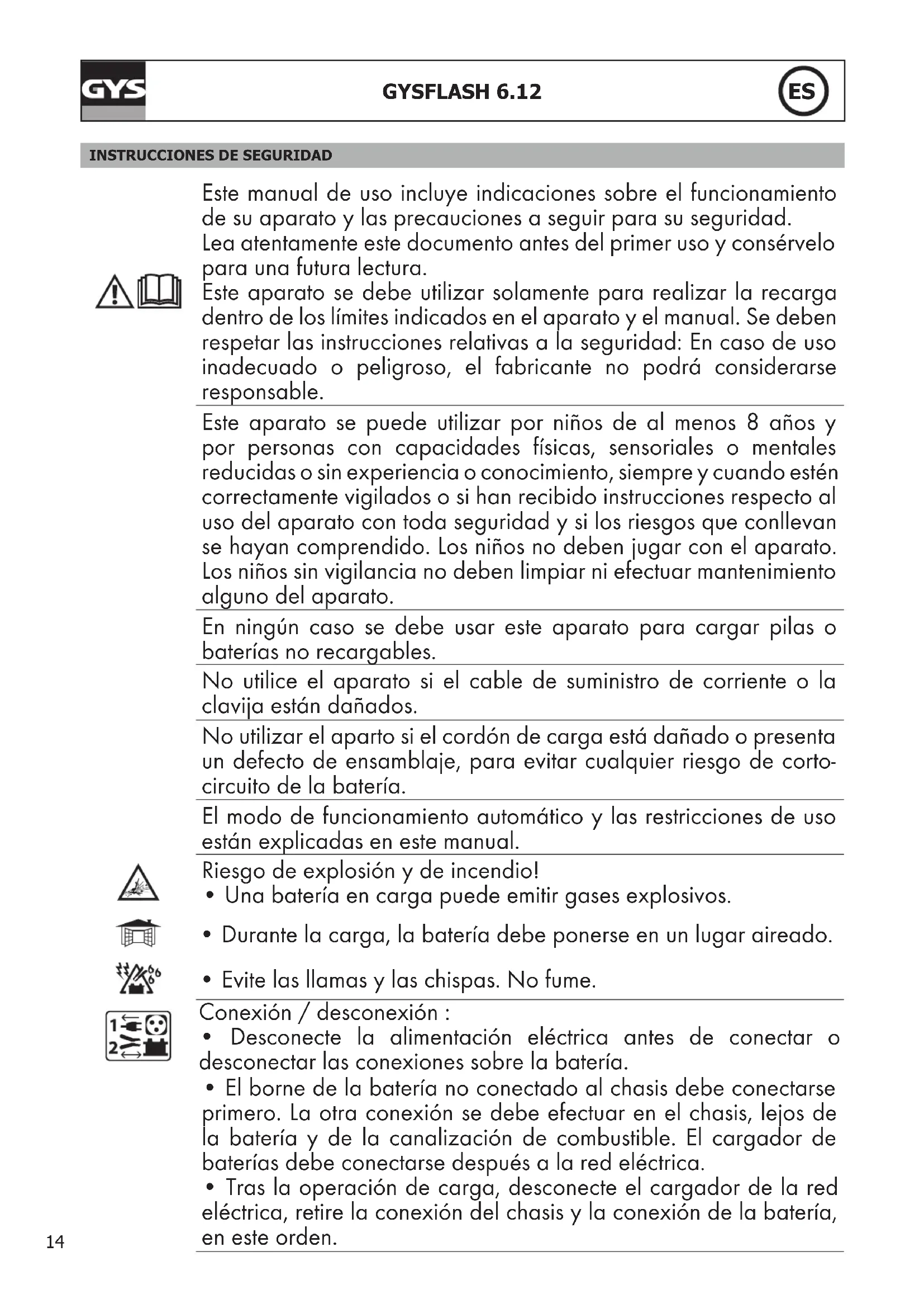 Este manual de uso incluye indicaciones sobre el funcionamiento de su aparato y las precauciones a seguir para su seguridad. Lea atentamente este documento antes del primer uso y consérvelo para una futura lectura. Este aparato se debe utilizar solamente para realizar la recarga dentro de los límites indicados en el aparato y el manual. Se deben respetar las instrucciones relativas a la seguridad: En caso de uso inadecuado o peligroso, el fabricante no podrá considerarse responsable. Este aparato se puede utilizar por niños de al menos 8 años y por personas con capacidades físicas, sensoriales o mentales reducidas o sin experiencia o conocimiento, siempre y cuando estén correctamente vigilados o si han recibido instrucciones respecto al uso del aparato con toda seguridad y si los riesgos que conllevan se hayan comprendido. Los niños no deben jugar con el aparato. Los niños sin vigilancia no deben limpiar ni efectuar mantenimiento alguno del aparato. En ningún caso se debe usar este aparato para cargar pilas o baterías no recargables. No utilice el aparato si el cable de suministro de corriente o la clavija están dañados. No utilizar el aparto si el cordón de carga está dañado o presenta un defecto de ensamblaje, para evitar cualquier riesgo de corto- circuito de la batería. El modo de funcionamiento automático y las restricciones de uso están explicadas en este manual. Riesgo de explosión y de incendio!