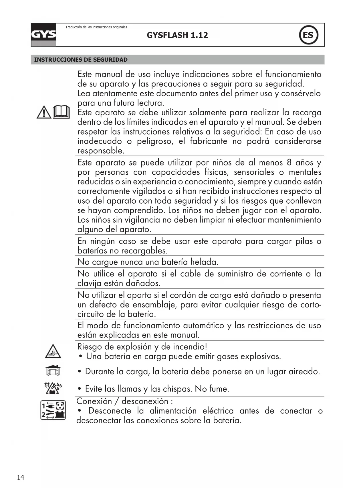 - Desconecte la alimentación eléctrica antes de conectar o desconectar las conexiones sobre la batería.15 GYSFLASH 1.12