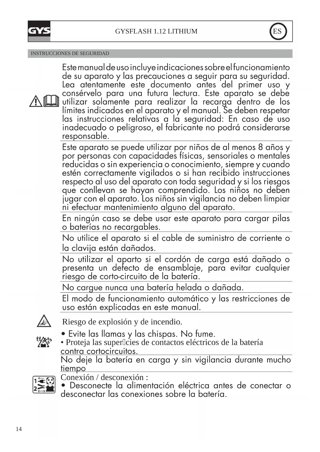 Este manual de uso incluye indicaciones sobre el funcionamiento de su aparato y las precauciones a seguir para su seguridad. Lea atentamente este documento antes del primer uso y consérvelo para una futura lectura. Este aparato se debe utilizar solamente para realizar la recarga dentro de los límites indicados en el aparato y el manual. Se deben respetar las instrucciones relativas a la seguridad: En caso de uso inadecuado o peligroso, el fabricante no podrá considerarse responsable. Este aparato se puede utilizar por niños de al menos 8 años y por personas con capacidades físicas, sensoriales o mentales reducidas o sin experiencia o conocimiento, siempre y cuando estén correctamente vigilados o si han recibido instrucciones respecto al uso del aparato con toda seguridad y si los riesgos que conllevan se hayan comprendido. Los niños no deben jugar con el aparato. Los niños sin vigilancia no deben limpiar ni efectuar mantenimiento alguno del aparato. En ningún caso se debe usar este aparato para cargar pilas o baterías no recargables. No utilice el aparato si el cable de suministro de corriente o la clavija están dañados. No utilizar el aparto si el cordón de carga está dañado o presenta un defecto de ensamblaje, para evitar cualquier riesgo de corto-circuito de la batería. No cargue nunca una batería helada o dañada. El modo de funcionamiento automático y las restricciones de uso están explicadas en este manual. Riesgo de explosión y de incendio.