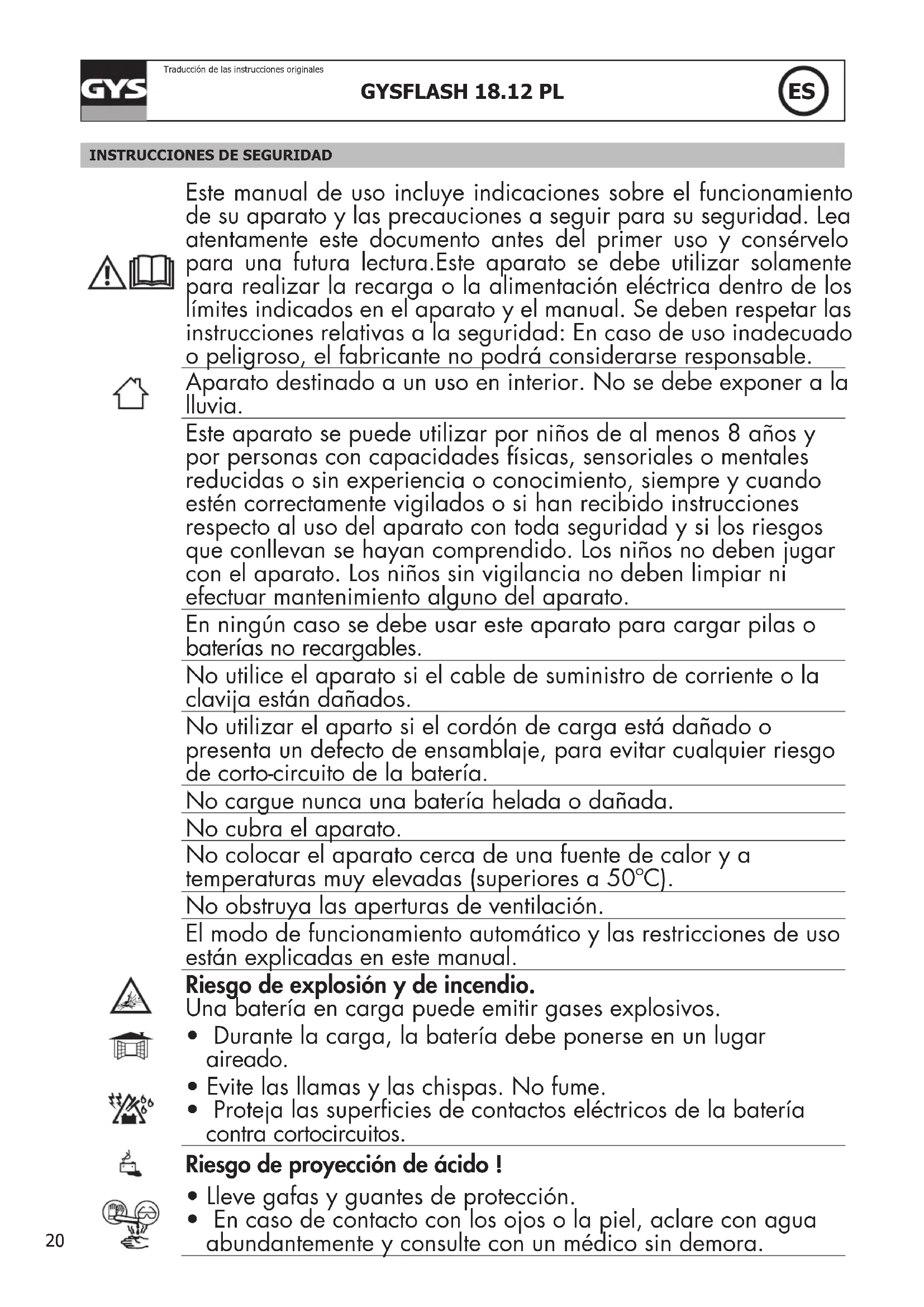 - En caso de contacto con los ojos o la piel, aclare con agua abundantemente y consulte con un médico sin demora.21 GYSFLASH 18.12 PL Traducción de las instrucciones originales
