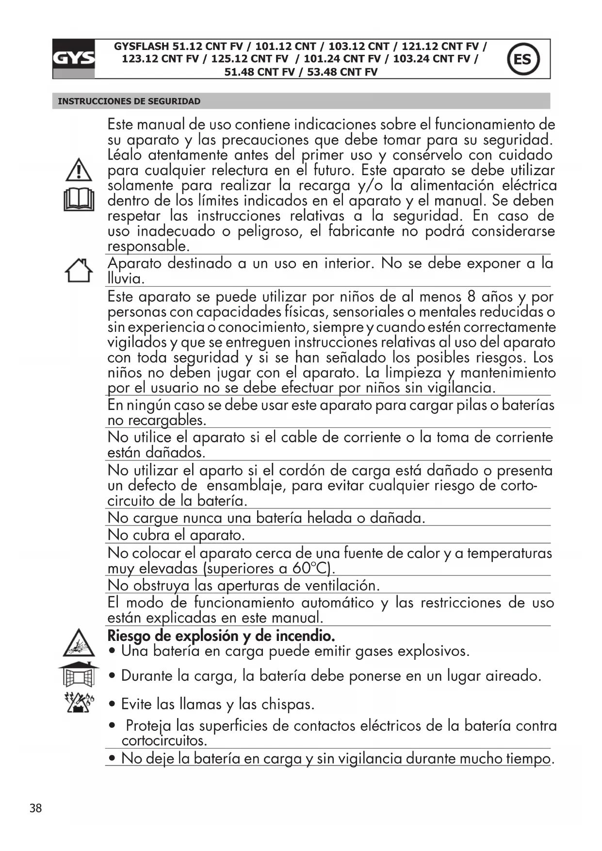 - No deje la batería en carga y sin vigilancia durante mucho tiempo.39 GYSFLASH 51.12 CNT FV / 101.12 CNT / 103.12 CNT / 121.12 CNT FV /