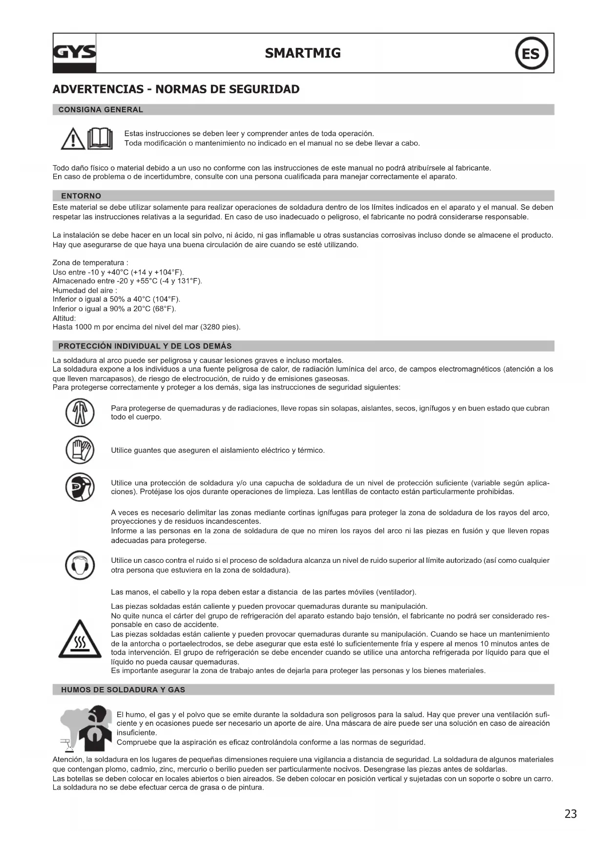 RECOMENDACIONES SOBRE LOS MÉTODOS DE REDUCCIÓN DE EMISIONES ELECTROMAGNÉTICAS a. Red eléctrica pública: conviene conectar el equipo de soldadura a la red eléctrica pública según las recomendaciones del fabricante. Si se produjeran interferencias, podría ser necesario tomar medidas de prevención suplementarias como el ltrado de la red pública de alimentación eléctrica. Se recomienda apantallar el cable de red eléctrica en un conducto metálico o equivalente para material de soldadura instalado de forma ja. Conviene asegurar la continuidad eléctrica del apantallado sobre toda la longitud. Se recomienda conectar el cable apantallado al generador de soldadura para asegurar un buen contacto eléctrico entre el conducto y la fuente de soldadura. b. Mantenimiento del material de soldadura al arco: conviene que el material de soldadura al arco esté sometido a un mantenimiento regular según las recomendaciones del fabricante. Los accesos, aperturas y carcasas metálicas estén correctamente cerradas cuando se utilice el material de soldadura al arco. El material de soldadura al arco no se debe modicar de ningún modo, salvo modicaciones y ajustes mencionados en el manual de instrucciones del fabricante. Se recomienda, en particular, que los dispositivos de cebado y de estabilización de arco se ajusten y se les haga un mantenimiento siguiendo las recomendaciones del fabricante. c. Cables de soldadura: Conviene que los cables sean lo más cortos posible, colocados cerca y a proximidad del suelo sobre este. d. Conexión equipotencial: Se recomienda comprobar los objetos metálicos de la zona de alrededor que pudieran crear un paso de corriente. En cualquier caso, los objetos metálicos junto a la pieza que se va a soldar incrementan el riesgo del operador a sufrir descargas eléctricas si toca estos elementos metálicos y el hilo a la vez. Conviene aislar al operador de esta clase de objetos metálicos. e. Conexión a tierra de la pieza a soldar: Cuando la pieza a soldar no está conectada a tierra para la seguridad eléctrica o debido a su dimensiones y lugar, como es el caso, por ejemplo de carcasas metálicas de barcos o en la carpintería metálica de edicios, una conexión a tierra de la pieza puede reducir en algunos casos las emisiones. Conviene evitar la conexión a tierra de piezas que podrían incrementar el riesgo de heridas para los usuarios o dañar otros materiales eléctricos. Si fuese necesario, conviene que la conexión a tierra de la pieza a soldar se haga directamente, pero en algunos países no se autoriza este conexión directa, por lo que conviene que la conexión se haga con un condensador apropiado seleccionado en función de la normativa nacional. f. Protección y blindaje: La protección y el blindaje selectivo de otros cables y materiales de la zona puede limitar los problemas de alteraciones. La protección de toda la zona de soldadura puedes ser necesaria para aplicaciones especiales. TRANSPORTE Y TRÁNSITO DE LA FUENTE DE CORRIENTE DE SOLDADURA El aparato está equipado de (un) mango (s) en la parte superior que permiten transportarlo con la mano. No se debe subestimar su peso. El (los) mango (s) no se debe (deben) considerar un modo para realizar la suspensión del producto. No utilice los cables o la antorcha para desplazar el aparato. Se debe desplazar en posición vertical. No transporte el generador de corriente por encima de otras personas u objetos. No eleve una botella de gas y el generador al mismo tiempo. Sus normas de transporte son distintas. Es preferible quitar la bobina antes de elevar o transportar el generador. Las corrientes vagabundas de soldadura pueden destruir los conductores de tierra, dañar el equipo y los dispositivos eléctricos y provocar el calentamiento de los componentes, pudiendo causar un incendio. ES26 SMARTMIG