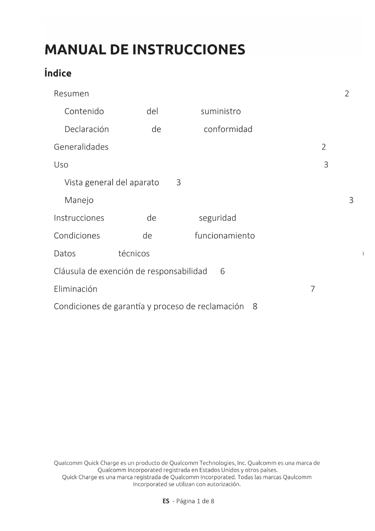 Lea atentamente estas instrucciones y observe y siga las indicaciones que guran en ellas a n de garanzar una larga vida úl y un uso able del aparato. Conserve esas instrucciones a mano y entrégueselas a otros usuarios del aparato. Acerca de estas instrucciones GENERALIDADES Declaración de conformidad El marcado CE indica que este producto cumple los requisitos de todas las Direcvas de la UE vigentes para este producto. Contenido del suministro RESUMEN Esta power bank o batería externa está desnada exclusivamente a la alimentación de corriente de disposivos con una tensión de servicio de 5V de corriente connua (teléfonos móviles, reproductores MP3, etc.), así como disposivos que admiten el estándar Power Delivery (PD) o el estándar tecnológico Qualcomm® Quick Charge™. Cualquier otro uso se considerará indebido, y puede causar desperfectos y lesiones. Este producto no está desnado al uso comercial o para aplicaciones médicas y especiales, en las que un fallo del producto puede causar considerables daños materiales, lesiones o la muerte. Queda excluida cualquier reclamación por daños derivados de un uso indebido o de la no observancia de las indicaciones de seguridad. Uso previsto