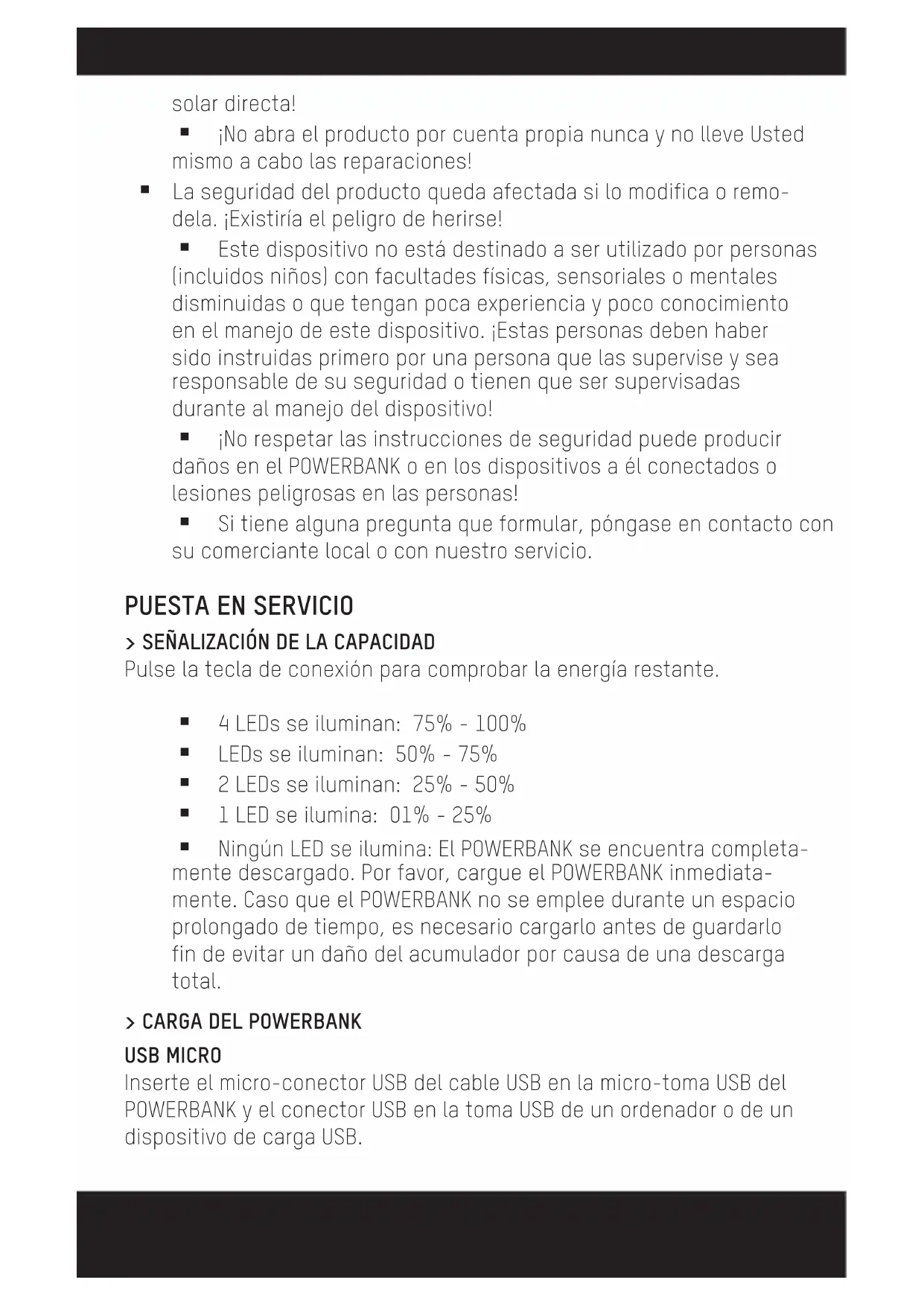 Pulse la tecla de conexión para comprobar la energía restante. 4 LEDs se iluminan: 75% - 100% LEDs se iluminan: 50% - 75% 2 LEDs se iluminan: 25% - 50% 1 LED se ilumina: 01% - 25% Ningún LED se ilumina: El POWERBANK se encuentra completa- mente descargado. Por favor, cargue el POWERBANK inmediata- mente. Caso que el POWERBANK no se emplee durante un espacio prolongado de tiempo, es necesario cargarlo antes de guardarlo fin de evitar un daño del acumulador por causa de una descarga total.