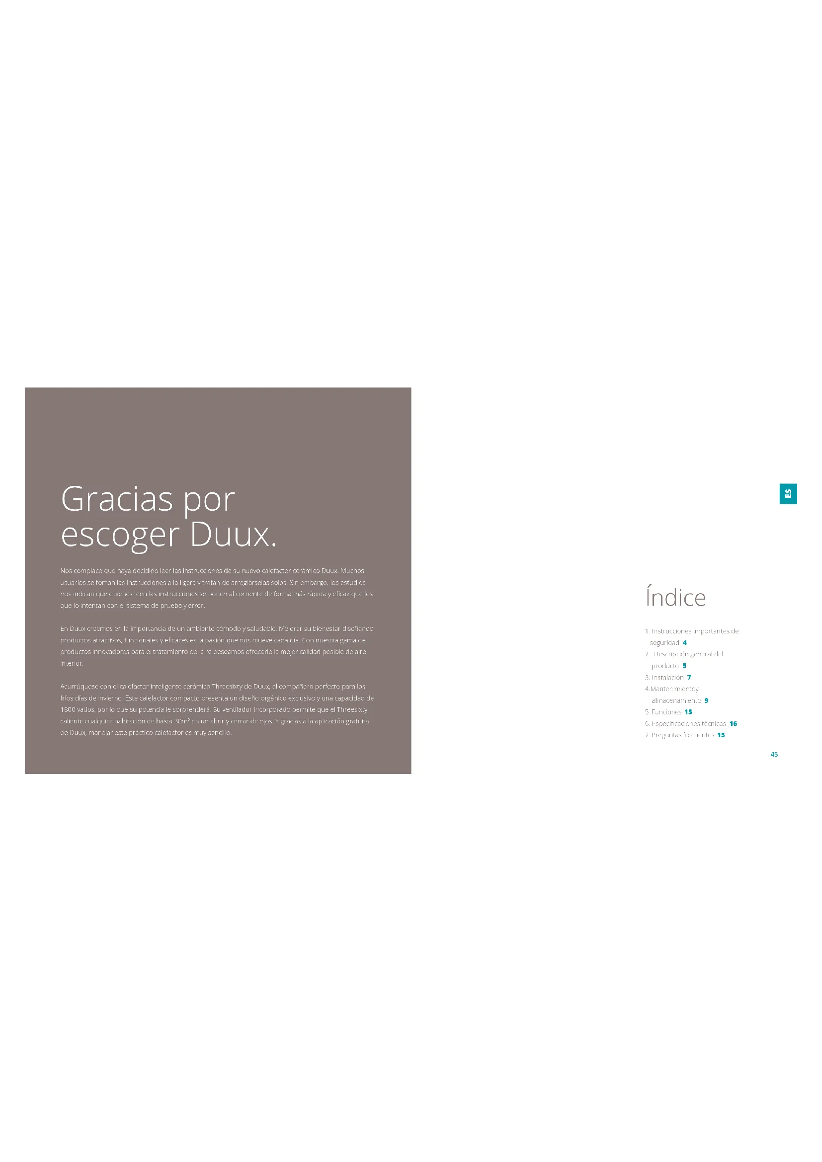 R.4544 Gracias por escoger Duux. Nos complace que haya decidido leer las instrucciones de su nuevo calefactor cerámico Duux. Muchos usuarios se toman las instrucciones a la ligera y tratan de arreglárselas solos. Sin embargo, los estudios nos indican que quienes leen las instrucciones se ponen al corriente de forma más rápida y ecaz que los que lo intentan con el sistema de prueba y error. En Duux creemos en la importancia de un ambiente cómodo y saludable. Mejorar su bienestar diseñando productos atractivos, funcionales y ecaces es la pasión que nos mueve cada día. Con nuestra gama de productos innovadores para el tratamiento del aire deseamos ofrecerle la mejor calidad posible de aire interior. Acurrúquese con el calefactor inteligente cerámico Threesixty de Duux, el compañero perfecto para los fríos días de invierno. Este calefactor compacto presenta un diseño orgánico exclusivo y una capacidad de 1800 vatios, por lo que su potencia le sorprenderá. Su ventilador incorporado permite que el Threesixty caliente cualquier habitación de hasta 30m² en un abrir y cerrar de ojos. Y gracias a la aplicación gratuita de Duux, manejar este práctico calefactor es muy sencillo.