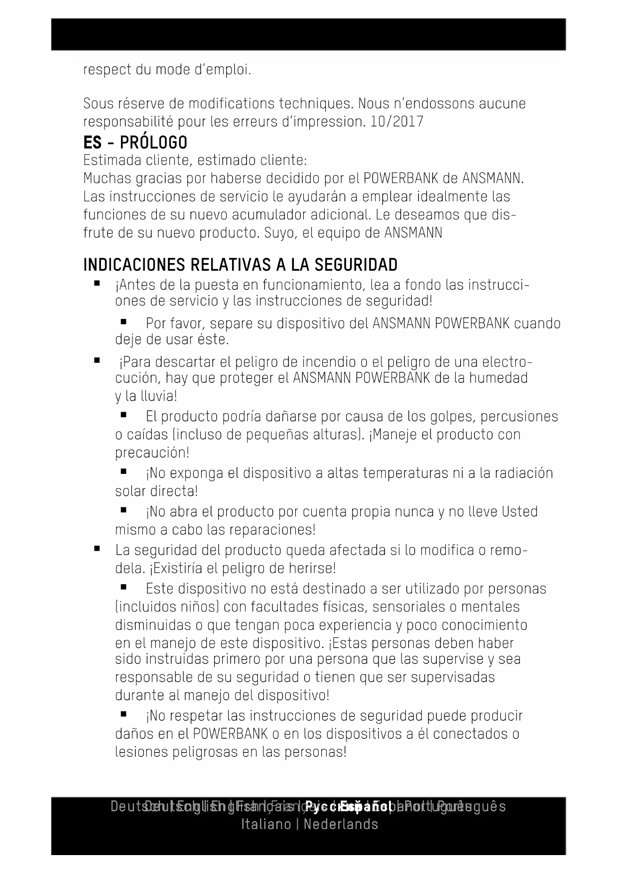 ¡Antes de la puesta en funcionamiento, lea a fondo las instrucci- ones de servicio y las instrucciones de seguridad! Por favor, separe su dispositivo del ANSMANN POWERBANK cuando deje de usar éste. ¡Para descartar el peligro de incendio o el peligro de una electro- cución, hay que proteger el ANSMANN POWERBANK de la humedad y la lluvia! El producto podría dañarse por causa de los golpes, percusiones o caídas (incluso de pequeñas alturas). ¡Maneje el producto con precaución! ¡No exponga el dispositivo a altas temperaturas ni a la radiación solar directa! ¡No abra el producto por cuenta propia nunca y no lleve Usted mismo a cabo las reparaciones! La seguridad del producto queda afectada si lo modifica o remo- dela. ¡Existiría el peligro de herirse! Este dispositivo no está destinado a ser utilizado por personas (incluidos niños) con facultades físicas, sensoriales o mentales disminuidas o que tengan poca experiencia y poco conocimiento en el manejo de este dispositivo. ¡Estas personas deben haber sido instruidas primero por una persona que las supervise y sea responsable de su seguridad o tienen que ser supervisadas durante al manejo del dispositivo! ¡No respetar las instrucciones de seguridad puede producir daños en el POWERBANK o en los dispositivos a él conectados o lesiones peligrosas en las personas! Deutsch | English | Français | Pусский | Español | Português Svenska | Italiano | Nederlands | Dansk Deutsch | English | Français | Español | Português Italiano | Nederlands Si tiene alguna pregunta que formular, póngase en contacto con su comerciante local o con nuestro servicio.