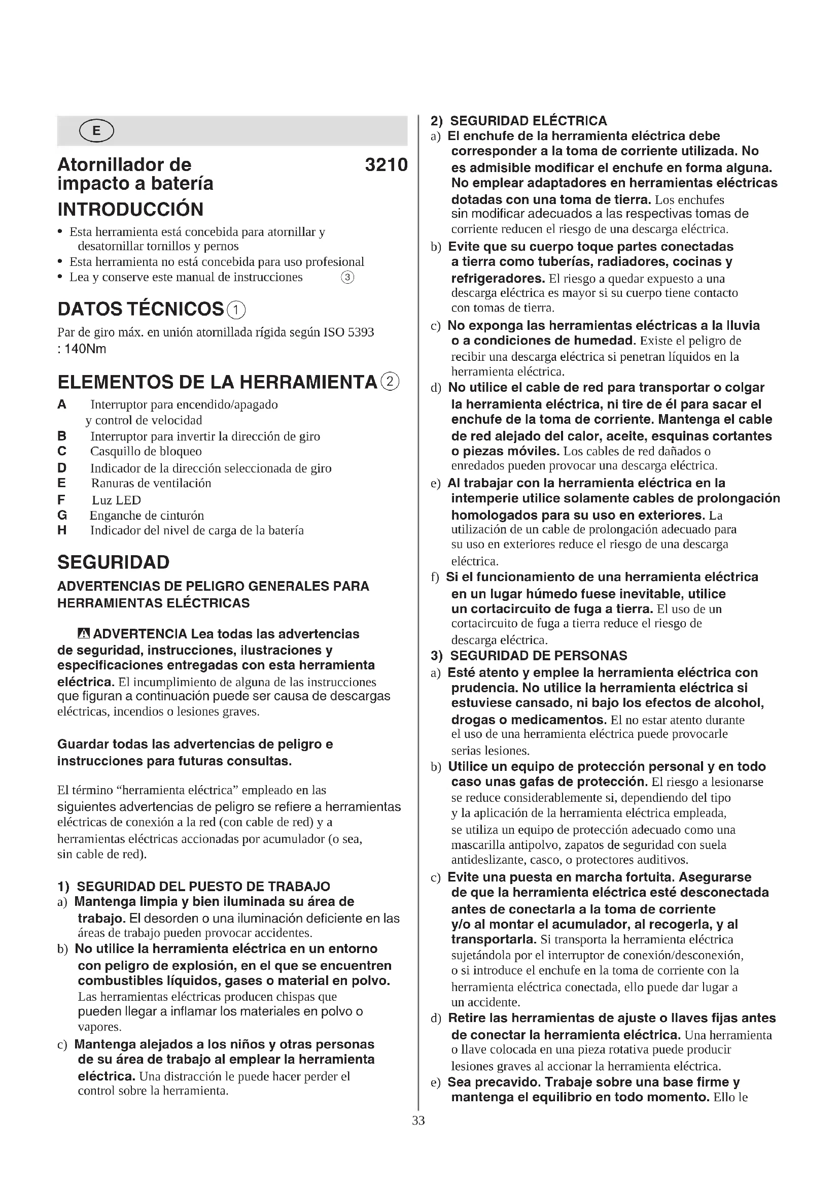 A Interruptor para encendido/apagado y control de velocidad B Interruptor para invertir la dirección de giro C Casquillo de bloqueo D Indicador de la dirección seleccionada de giro E Ranuras de ventilación F Luz LED G Enganche de cinturón H Indicador del nivel de carga de la batería SEGURIDAD