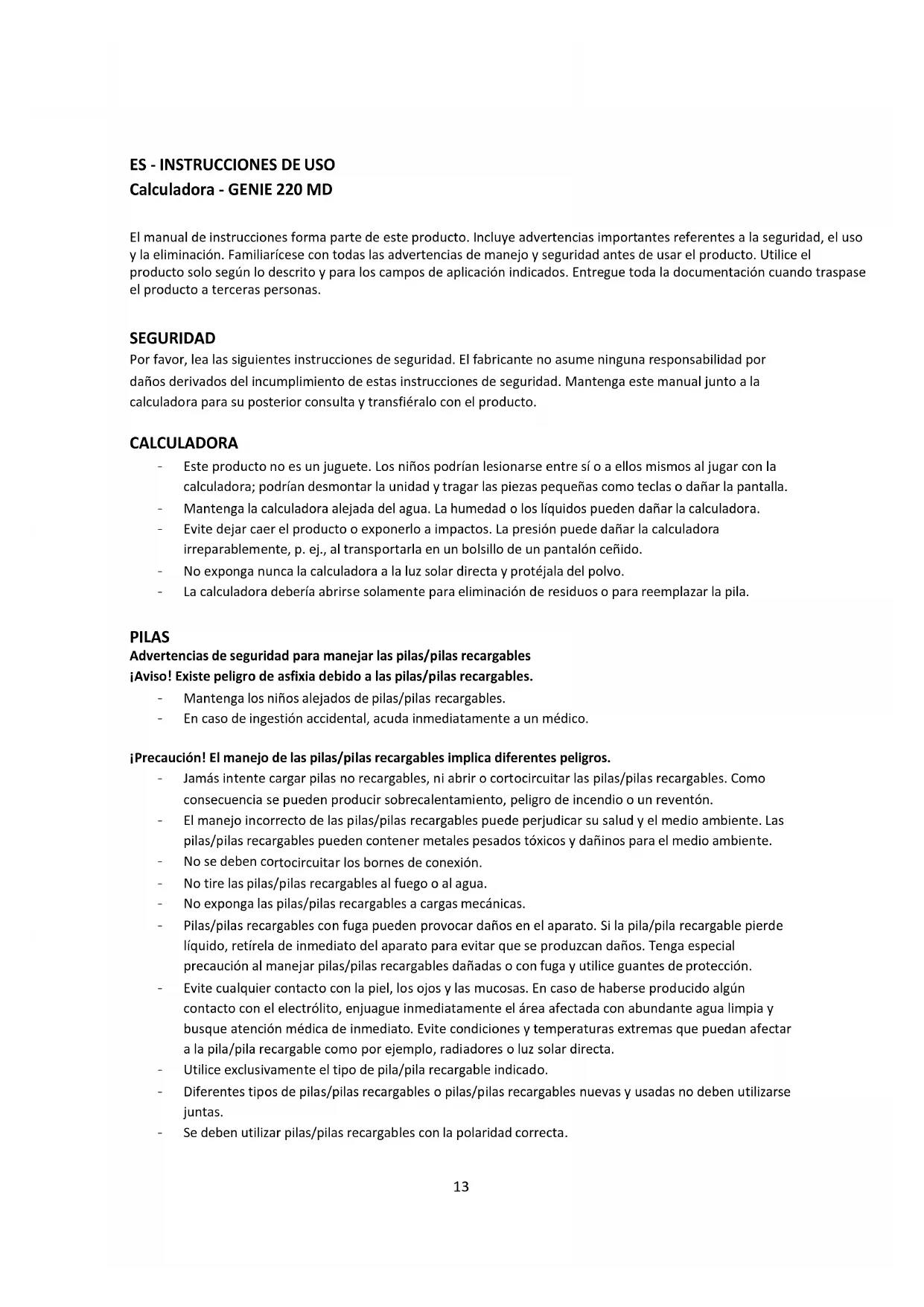 Calculadora - GENIE 220 MD El manual de instrucciones forma parte de este producto. Incluye advertencias importantes referentes a la seguridad, el uso y la eliminación. Familiarícese con todas las advertencias de manejo y seguridad antes de usar el producto. Utilice el producto solo según lo descrito y para los campos de aplicación indicados. Entregue toda la documentación cuando traspase el producto a terceras personas. SEGURIDAD Por favor, lea las siguientes instrucciones de seguridad. El fabricante no asume ninguna responsabilidad por daños derivados del incumplimiento de estas instrucciones de seguridad. Mantenga este manual junto a la calculadora para su posterior consulta y transfiéralo con el producto. CALCULADORA - Este producto no es un juguete. Los niños podrían lesionarse entre sí o a ellos mismos al jugar con la calculadora; podrían desmontar la unidad y tragar las piezas pequeñas como teclas o dañar la pantalla. - Mantenga la calculadora alejada del agua. La humedad o los líquidos pueden dañar la calculadora. - Evite dejar caer el producto o exponerlo a impactos. La presión puede dañar la calculadora irreparablemente, p. ej., al transportarla en un bolsillo de un pantalón ceñido. - No exponga nunca la calculadora a la luz solar directa y protéjala del polvo. - La calculadora debería abrirse solamente para eliminación de residuos o para reemplazar la pila. PILAS Advertencias de seguridad para manejar las pilas/pilas recargables ¡Aviso! Existe peligro de asfixia debido a las pilas/pilas recargables. - Mantenga los niños alejados de pilas/pilas recargables. - En caso de ingestión accidental, acuda inmediatamente a un médico. ¡Precaución! El manejo de las pilas/pilas recargables implica diferentes peligros. - Jamás intente cargar pilas no recargables, ni abrir o cortocircuitar las pilas/pilas recargables. Como consecuencia se pueden producir sobrecalentamiento, peligro de incendio o un reventón. - El manejo incorrecto de las pilas/pilas recargables puede perjudicar su salud y el medio ambiente. Las pilas/pilas recargables pueden contener metales pesados tóxicos y dañinos para el medio ambiente. - No se deben co rtocircuitar los bornes de conexión. - No tire las pilas/pilas recargables al fuego o al agua. - No exponga las pilas/pilas recargables a cargas mecánicas. - Pilas/pilas recargables con fuga pueden provocar daños en el aparato. Si la pila/pila recargable pierde líquido, retírela de inmediato del aparato para evitar que se produzcan daños. Tenga especial precaución al manejar pilas/pilas recargables dañadas o con fuga y utilice guantes de protección. - Evite cualquier contacto con la piel, los ojos y las mucosas. En caso de haberse producido algún contacto con el electrólito, enjuague inmediatamente el área afectada con abundante agua limpia y busque atención médica de inmediato. Evite condiciones y temperaturas extremas que puedan afectar a la pila/pila recargable como por ejemplo, radiadores o luz solar directa. - Utilice exclusivamente el tipo de pila/pila recargable indicado. - Diferentes tipos de pilas/pilas recargables o pilas/pilas recargables nuevas y usadas no deben utilizarse juntas. - Se deben utilizar pilas/pilas recargables con la polaridad correcta.14