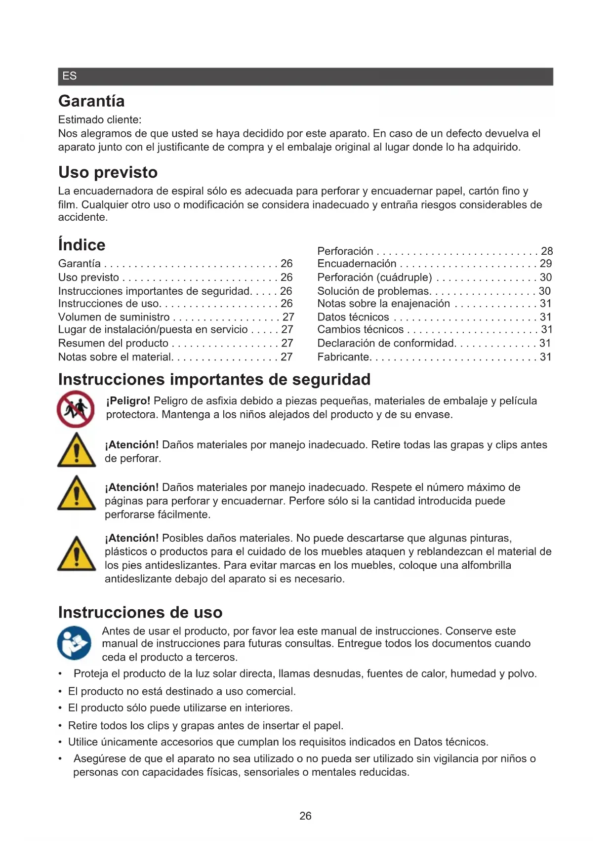 - Garantía Estimado cliente: Nos alegramos de que usted se haya decidido por este aparato. En caso de un defecto devuelva el aparato junto con el justicante de compra y el embalaje original al lugar donde lo ha adquirido. Uso previsto La encuadernadora de espiral sólo es adecuada para perforar y encuadernar papel, cartón no y lm. Cualquier otro uso o modicación se considera inadecuado y entraña riesgos considerables de accidente. Índice Garantía p. 26