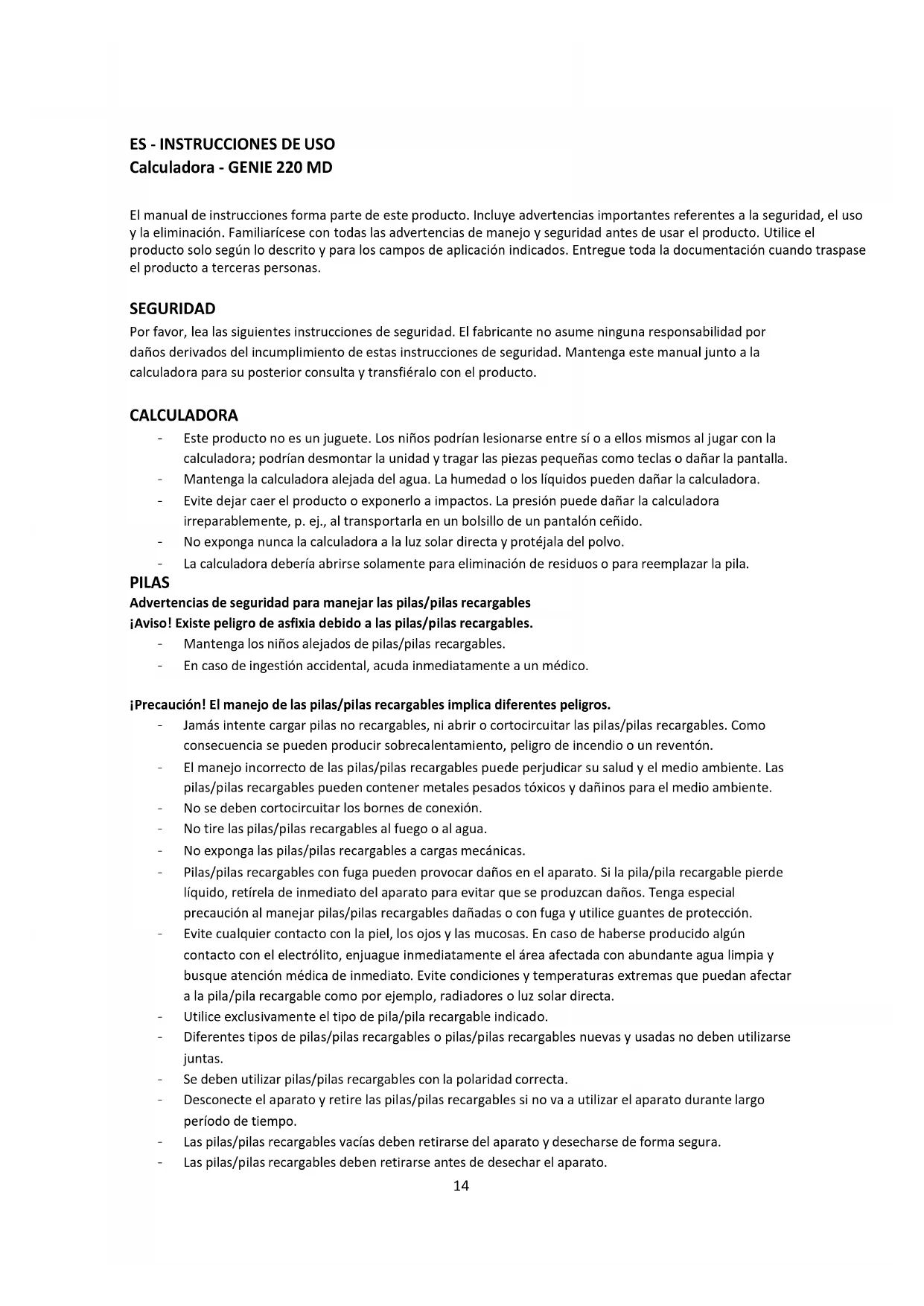 Calculadora - GENIE 220 MD El manual de instrucciones forma parte de este producto. Incluye advertencias importantes referentes a la seguridad, el uso y la eliminación. Familiarícese con todas las advertencias de manejo y seguridad antes de usar el producto. Utilice el producto solo según lo descrito y para los campos de aplicación indicados. Entregue toda la documentación cuando traspase el producto a terceras personas. SEGURIDAD Por favor, lea las siguientes instrucciones de seguridad. El fabricante no asume ninguna responsabilidad por daños derivados del incumplimiento de estas instrucciones de seguridad. Mantenga este manual junto a la calculadora para su posterior consulta y transfiéralo con el producto. CALCULADORA - Este producto no es un juguete. Los niños podrían lesionarse entre sí o a ellos mismos al jugar con la calculadora; podrían desmontar la unidad y tragar las piezas pequeñas como teclas o dañar la pantalla. - Mantenga la calculadora alejada del agua. La humedad o los líquidos pueden dañar la calculadora. - Evite dejar caer el producto o exponerlo a impactos. La presión puede dañar la calculadora irreparablemente, p. ej., al transportarla en un bolsillo de un pantalón ceñido. - No exponga nunca la calculadora a la luz solar directa y protéjala del polvo. - La calculadora debería abrirse solamente para eliminación de residuos o para reemplazar la pila. PILAS Advertencias de seguridad para manejar las pilas/pilas recargables ¡Aviso! Existe peligro de asfixia debido a las pilas/pilas recargables. - Mantenga los niños alejados de pilas/pilas recargables. - En caso de ingestión accidental, acuda inmediatamente a un médico. ¡Precaución! El manejo de las pilas/pilas recargables implica diferentes peligros. - Jamás intente cargar pilas no recargables, ni abrir o cortocircuitar las pilas/pilas recargables. Como consecuencia se pueden producir sobrecalentamiento, peligro de incendio o un reventón. - El manejo incorrecto de las pilas/pilas recargables puede perjudicar su salud y el medio ambiente. Las pilas/pilas recargables pueden contener metales pesados tóxicos y dañinos para el medio ambiente. - No se deben co rtocircuitar los bornes de conexión. - No tire las pilas/pilas recargables al fuego o al agua. - No exponga las pilas/pilas recargables a cargas mecánicas. - Pilas/pilas recargables con fuga pueden provocar daños en el aparato. Si la pila/pila recargable pierde líquido, retírela de inmediato del aparato para evitar que se produzcan daños. Tenga especial precaución al manejar pilas/pilas recargables dañadas o con fuga y utilice guantes de protección. - Evite cualquier contacto con la piel, los ojos y las mucosas. En caso de haberse producido algún contacto con el electrólito, enjuague inmediatamente el área afectada con abundante agua limpia y busque atención médica de inmediato. Evite condiciones y temperaturas extremas que puedan afectar a la pila/pila recargable como por ejemplo, radiadores o luz solar directa. - Utilice exclusivamente el tipo de pila/pila recargable indicado. - Diferentes tipos de pilas/pilas recargables o pilas/pilas recargables nuevas y usadas no deben utilizarse juntas. - Se deben utilizar pilas/pilas recargables con la polaridad correcta. - Desconecte el aparato y retire las pilas/pilas recargables si no va a utilizar el aparato durante largo período de tiempo. - Las pilas/pilas recargables vacías deben retirarse del aparato y desecharse de forma segura. - Las pilas/pilas recargables deben retirarse antes de desechar el aparato.15
