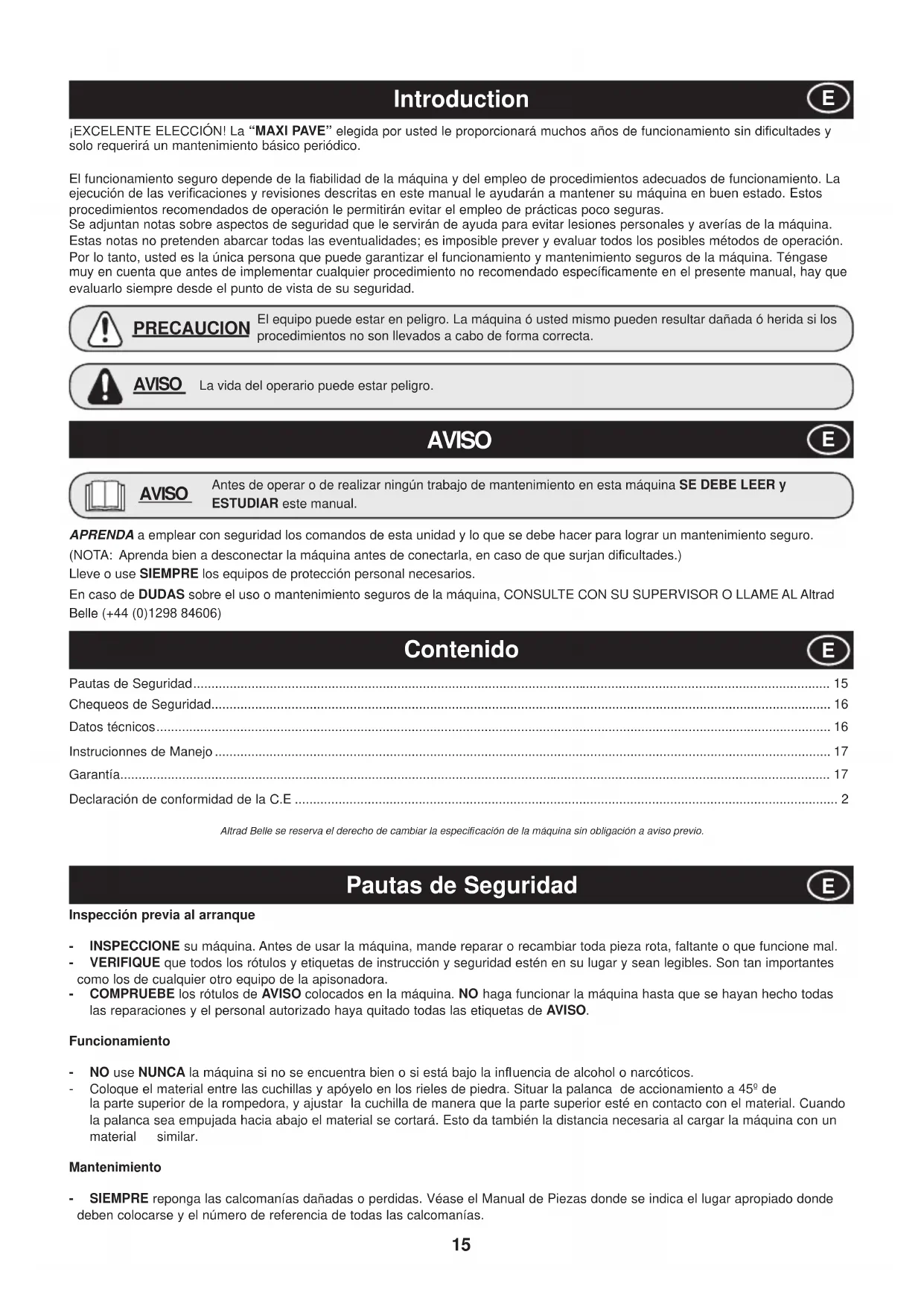 - ¡EXCELENTE ELECCIÓN! La “MAXI PAVE” elegida por usted le proporcionará muchos años de funcionamiento sin di¿ cultades y solo requerirá un mantenimiento básico periódico. El funcionamiento seguro depende de la ¿ abilidad de la máquina y del empleo de procedimientos adecuados de funcionamiento. La ejecución de las veri¿ caciones y revisiones descritas en este manual le ayudarán a mantener su máquina en buen estado. Estos procedimientos recomendados de operación le permitirán evitar el empleo de prácticas poco seguras. Se adjuntan notas sobre aspectos de seguridad que le servirán de ayuda para evitar lesiones personales y averías de la máquina. Estas notas no pretenden abarcar todas las eventualidades; es imposible prever y evaluar todos los posibles métodos de operación. Por lo tanto, usted es la única persona que puede garantizar el funcionamiento y mantenimiento seguros de la máquina. Téngase muy en cuenta que antes de implementar cualquier procedimiento no recomendado especí¿ camente en el presente manual, hay que evaluarlo siempre desde el punto de vista de su seguridad. Pautas de Seguridad p. 15