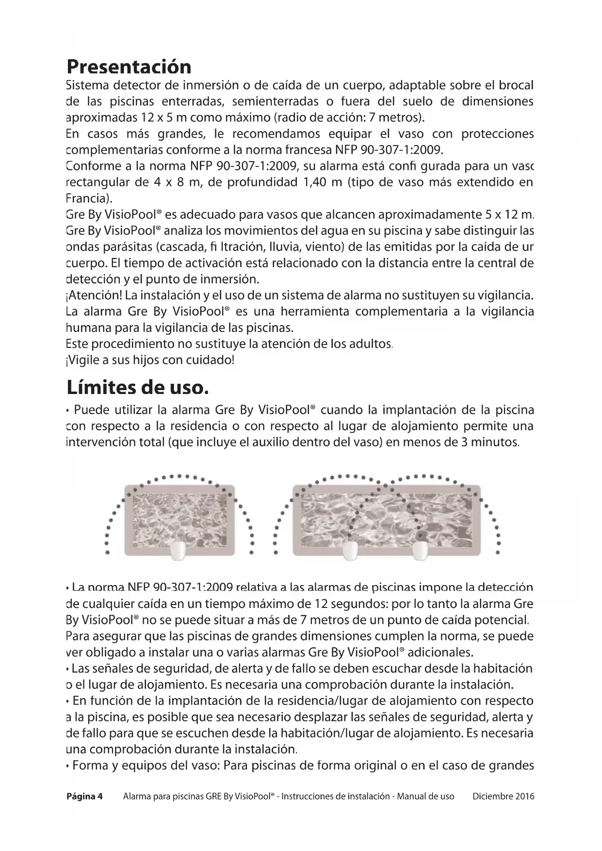 - Información permanente sobre el estado de vigilancia Instrucciones de instalación - Manual de uso Leer detenidamente y conservar para consulta posterior. porPágina 2 Alarma para piscinas GRE By VisioPool® - Instrucciones de instalación - Manual de uso Diciembre 2016 ADVERTENCIA Estimada señora o señor: Acaba de adquirir un dispositivo de alarma para piscina conforme a la norma francesa NFP 90-307-1:2009. Este sistema no sustituye el sentido común ni la responsabilidad individual. ¡La seguridad de sus hijos solo depende de usted! El riesgo es máximo cuando los niños son menores de 5 años. ¡Los accidentes no solo pasan a los demás! ¡Esté preparado para reaccionar! Bajo ninguna circunstancia se podrá responsabilizar a la sociedad ACIS de la caída o ahogamiento de ninguna persona o animal. La puesta en servicio del dispositivo Gre By VisioPool® no debe disminuir su vigilancia o sustituir una vigilancia activa de la piscina y alrededores. Garantía: para bene ciarse completamente de la garantía Gre By VisioPool®, es imperativo rellenar y rmar la cha de garantía suministrada y enviarla en un plazo de 8 días a la sociedad ACIS - 15, rue des Marais - 44310 ST PHILBERT DE GRAND LIEU (Francia) por correo certi cado (carta certi cada con acuse de recepción, correo certi cado de Correos). La garantía de la alarma Gre By VisioPool® solo entrará en vigor cuando se reciba el certi cado de garantía debidamente rellenado. Si no se reciben estos documentos, no se podrá otorgar ninguna garantía. Leer detenidamente y conservar cualquier documento relativo a la alarma Gre By VisioPool® para consulta posterior.Diciembre 2016 Alarma para piscinas GRE By VisioPool® - Instrucciones de instalación - Manual de uso Página 3 Indice Advertencia ........................................................................................... 4 Controles preliminares .................................................................. 5 Control del embalaje y de los componentes ............................ 5 Control previo a la puesta en servicio ......................................... 6 Selección de la implantación .......................................................... 7 Instalación sobre el brocal ........................................................... 8 Prueba de funcionamiento en el vaso .....................................9 Pilas alcalinas ......................................................................................10 Uso .......................................................................................................... 11 Invernada .............................................................................................11 Parada completa ............................................................................... 12 Aviso ...................................................................................................... 12 Informaciones complementarias .................................................13 Informaciones légales ..................................................................... 13 Informaciones relacionadas con la alarma Gre By VisioPool® ... 13 Consejos de seguridad ................................................................14Página 4 Alarma para piscinas GRE By VisioPool® - Instrucciones de instalación - Manual de uso Diciembre 2016 Presentación Sistema detector de inmersión o de caída de un cuerpo, adaptable sobre el brocal de las piscinas enterradas, semienterradas o fuera del suelo de dimensiones aproximadas 12 x 5 m como máximo (radio de acción: 7 metros). En casos más grandes, le recomendamos equipar el vaso con protecciones complementarias conforme a la norma francesa NFP 90-307-1:2009. Conforme a la norma NFP 90-307-1:2009, su alarma está con gurada para un vaso rectangular de 4 x 8 m, de profundidad 1,40 m (tipo de vaso más extendido en Francia). Gre By VisioPool® es adecuado para vasos que alcancen aproximadamente 5 x 12 m. Gre By VisioPool® analiza los movimientos del agua en su piscina y sabe distinguir las ondas parásitas (cascada, ltración, lluvia, viento) de las emitidas por la caída de un cuerpo. El tiempo de activación está relacionado con la distancia entre la central de detección y el punto de inmersión. ¡Atención! La instalación y el uso de un sistema de alarma no sustituyen su vigilancia. La alarma Gre By VisioPool® es una herramienta complementaria a la vigilancia humana para la vigilancia de las piscinas. Este procedimiento no sustituye la atención de los adultos. ¡Vigile a sus hijos con cuidado! Límites de uso.