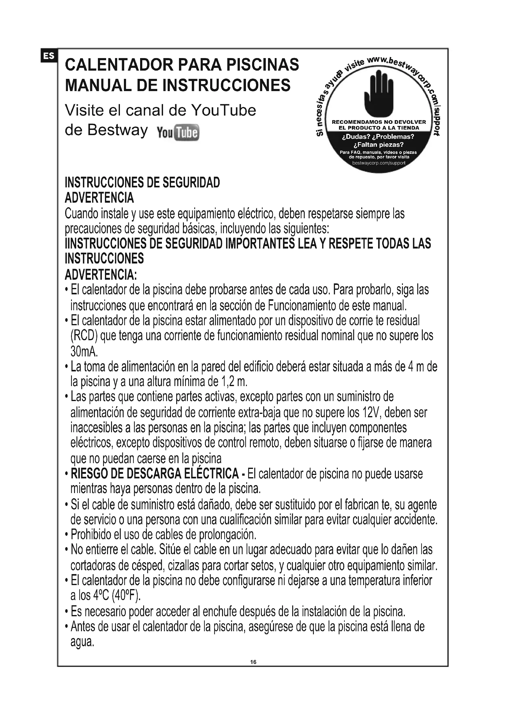 - Este producto no ha sido diseñado para un uso comercial. IMPORTANTE: Si usa el calentador de la piscina con un suministro eléctrico que no corresponda con el indicado, es peligroso y puede provocar un fallo grave del calentador de la piscina. GUARDAR ESTAS INSTRUCCIONES. AVISO PRCD ADVERTENCIA: Para evitar el riesgo de descarga eléctrica, el enchufe PRCD debe probarse antes de cada uso. ADVERTENCIA: Antes de insertar la clavija en una toma de corriente, asegúrese de RECOMENDAMOS NO DEVOLVEREL PRODUCTO A LA TIENDA¿Dudas? ¿Problemas?¿Faltan piezas?Para FAQ, manuals, videos o piezasde repuesto, por favor visitabestwaycorp.com/support