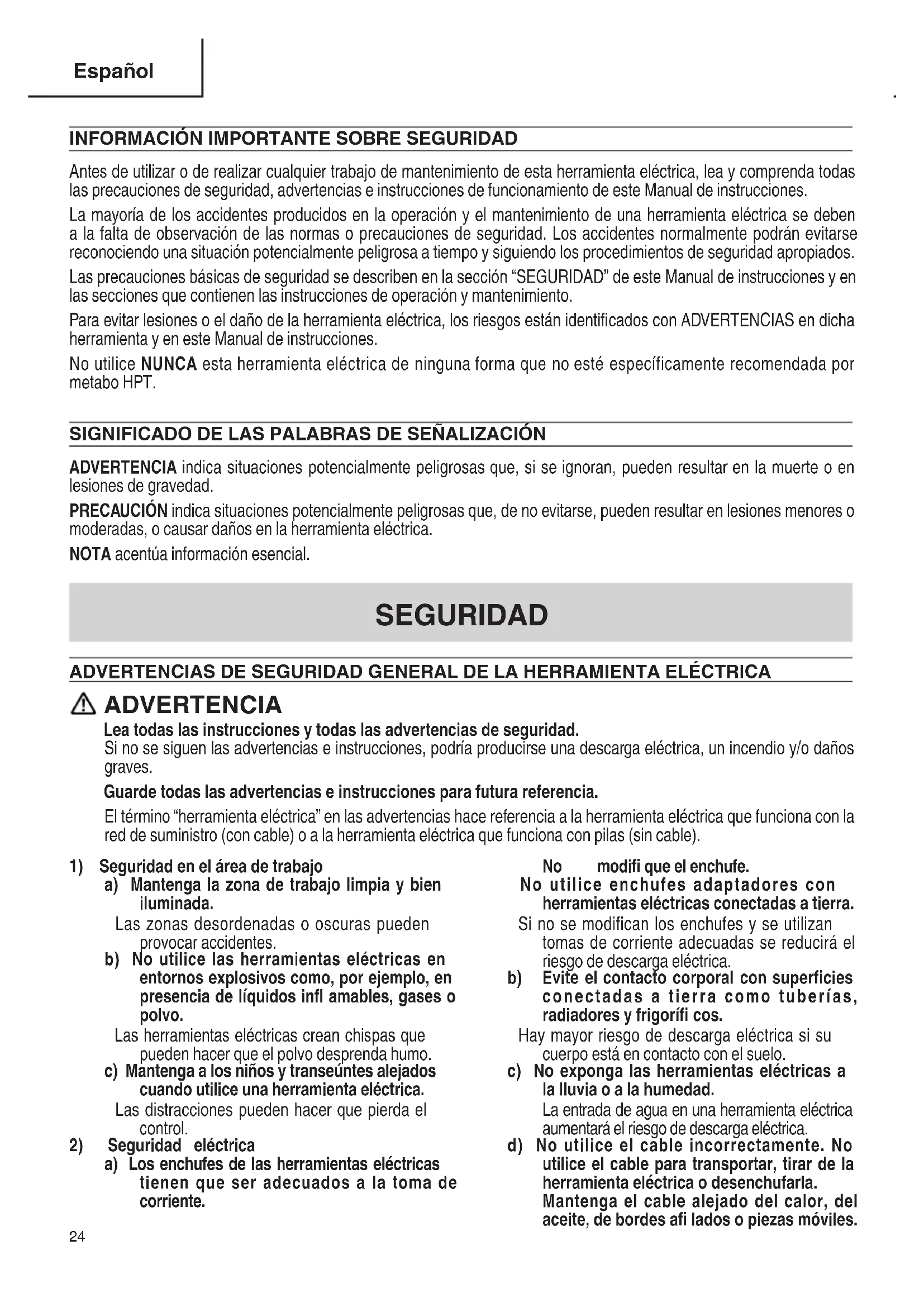 Antes de utilizar o de realizar cualquier trabajo de mantenimiento de esta herramienta eléctrica, lea y comprenda todas las precauciones de seguridad, advertencias e instrucciones de funcionamiento de este Manual de instrucciones. La mayoría de los accidentes producidos en la operación y el mantenimiento de una herramienta eléctrica se deben a la falta de observación de las normas o precauciones de seguridad. Los accidentes normalmente podrán evitarse reconociendo una situación potencialmente peligrosa a tiempo y siguiendo los procedimientos de seguridad apropiados. Las precauciones básicas de seguridad se describen en la sección “SEGURIDAD” de este Manual de instrucciones y en las secciones que contienen las instrucciones de operación y mantenimiento. Para evitar lesiones o el daño de la herramienta eléctrica, los riesgos están identifi cados con ADVERTENCIAS en dicha herramienta y en este Manual de instrucciones. No utilice NUNCA esta herramienta eléctrica de ninguna forma que no esté específicamente recomendada por metabo HPT. SIGNIFICADO DE LAS PALABRAS DE SEÑALIZACIÓN ADVERTENCIA indica situaciones potencialmente peligrosas que, si se ignoran, pueden resultar en la muerte o en lesiones de gravedad. PRECAUCIÓN indica situaciones potencialmente peligrosas que, de no evitarse, pueden resultar en lesiones menores o moderadas, o causar daños en la herramienta eléctrica. NOTA acentúa información esencial.