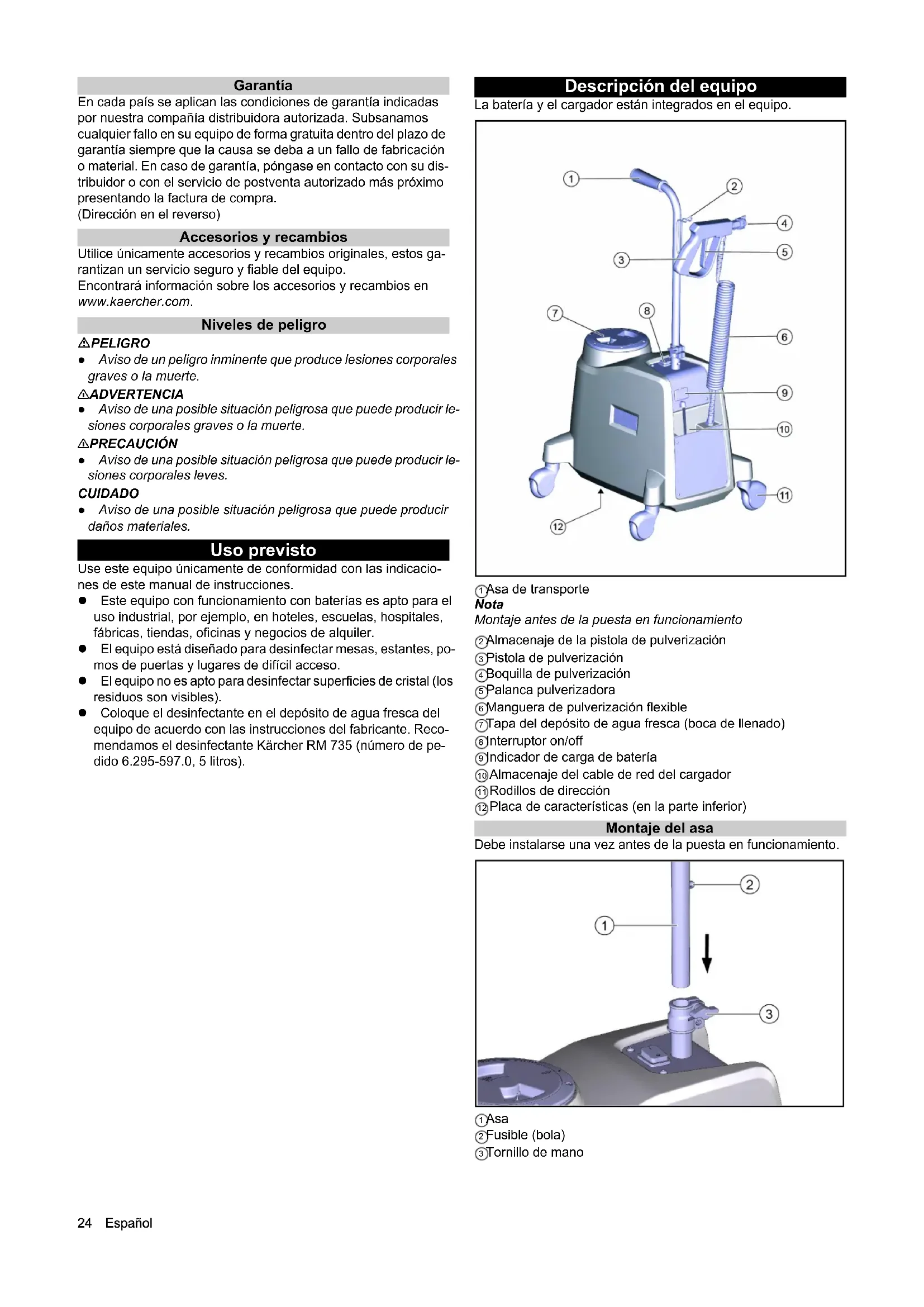 - Declaración de conformidad UE Español Garantía En cada país se aplican las condiciones de garantía indicadas por nuestra compañía distribuidora autorizada. Subsanamos cualquier fallo en su equipo de forma gratuita dentro del plazo de garantía siempre que la causa se deba a un fallo de fabricación o material. En caso de garantía, póngase en contacto con su dis- tribuidor o con el servicio de postventa autorizado más próximo presentando la factura de compra. (Dirección en el reverso) Accesorios y recambios Utilice únicamente accesorios y recambios originales, estos ga- rantizan un servicio seguro y fiable del equipo. Encontrará información sobre los accesorios y recambios en www.kaercher.com. Niveles de peligro PELIGRO ● Aviso de un peligro inminente que produce lesiones corporales graves o la muerte. 몇 ADVERTENCIA ● Aviso de una posible situación peligrosa que puede producir le- siones corporales graves o la muerte. 몇 PRECAUCIÓN ● Aviso de una posible situación peligrosa que puede producir le- siones corporales leves. CUIDADO ● Aviso de una posible situación peligrosa que puede producir daños materiales. Uso previsto Use este equipo únicamente de conformidad con las indicacio- nes de este manual de instrucciones. Este equipo con funcionamiento con baterías es apto para el uso industrial, por ejemplo, en hoteles, escuelas, hospitales, fábricas, tiendas, oficinas y negocios de alquiler. El equipo está diseñado para desinfectar mesas, estantes, po- mos de puertas y lugares de difícil acceso. El equipo no es apto para desinfectar superficies de cristal (los residuos son visibles). Coloque el desinfectante en el depósito de agua fresca del equipo de acuerdo con las instrucciones del fabricante. Reco- mendamos el desinfectante Kärcher RM 735 (número de pe- dido 6.295-597.0, 5 litros). Descripción del equipo La batería y el cargador están integrados en el equipo. 1 Asa de transporte Nota Montaje antes de la puesta en funcionamiento 2 Almacenaje de la pistola de pulverización 3 Pistola de pulverización 4 Boquilla de pulverización 5 Palanca pulverizadora 6 Manguera de pulverización flexible 7 Tapa del depósito de agua fresca (boca de llenado) 8 Interruptor on/off 9 Indicador de carga de batería 10 Almacenaje del cable de red del cargador 11 Rodillos de dirección 12 Placa de características (en la parte inferior) Montaje del asa Debe instalarse una vez antes de la puesta en funcionamiento. 1 Asa 2 Fusible (bola) 3 Tornillo de manoEspañol 25 p. 2724