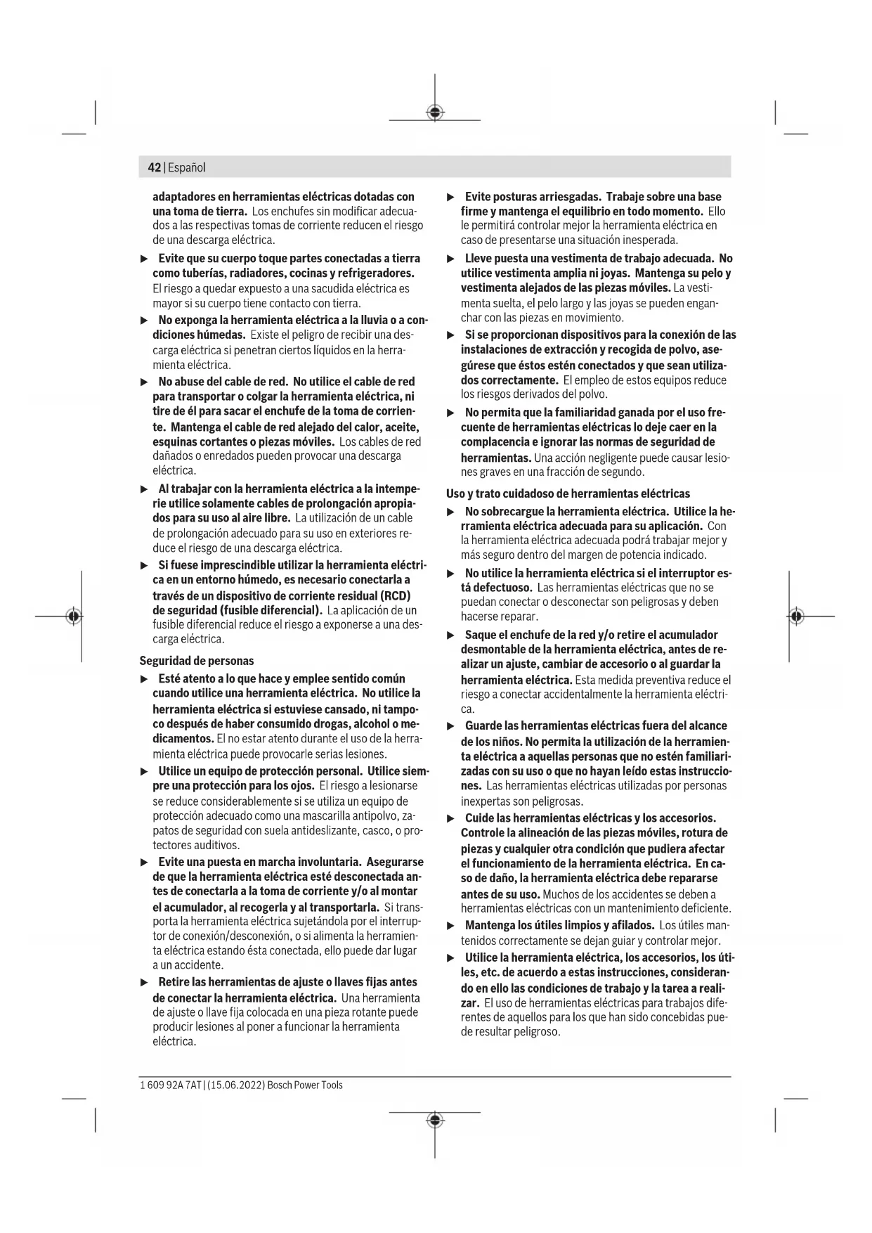 El amolado de chapas finas o de otros materiales que vibran ligera- mente y tienen una gran superficie puede conducir a un aumento del valor de emisión de ruidos de hasta 15dB. Es posible reducir el au- mento de la emisión acústica mediante el uso de esteras de amorti- guación pesadas adecuadas. Una mayor emisión de ruidos debe te- nerse en cuenta tanto en la evaluación de riesgos de la potencia de ruidos así como en la selección de una protección auditiva adecuada. El nivel de vibraciones y el valor de emisiones de ruidos indi- cados en estas instrucciones han sido determinados según un procedimiento de medición normalizado y pueden servir como base de comparación con otras herramientas eléctri- cas. También son adecuados para estimar provisionalmente la emisión de vibraciones y ruidos. El nivel de vibraciones y el valor de emisiones de ruidos indi- cados han sido determinados para las aplicaciones principa- les de la herramienta eléctrica. Por ello, el nivel de vibracio- nes y el valor de emisiones de ruidos pueden ser diferentes si la herramienta eléctrica se utiliza para otras aplicaciones, con útiles diferentes, o si el mantenimiento de la misma fue- se deficiente. Ello puede suponer un aumento drástico de la Bosch Power Tools 1 609 92A 7AT | (15.06.2022)48 | Español emisión de vibraciones y de ruidos durante el tiempo total de trabajo. Para determinar con exactitud las emisiones de vibraciones y de ruidos, es necesario considerar también aquellos tiem- pos en los que el aparato esté desconectado, o bien, esté en funcionamiento, pero sin ser utilizado realmente. Ello puede suponer una disminución drástica de las emisiones de vibra- ciones y de ruidos durante el tiempo total de trabajo. Fije unas medidas de seguridad adicionales para proteger al usuario de los efectos por vibraciones, como por ejemplo: Mantenimiento de la herramienta eléctrica y de los útiles, conservar calientes las manos, organización de las secuen- cias de trabajo. Desconexión de retroceso En el caso de un repentino contragolpe de la herramienta eléctrica, p. ej. bloqueo en el cor- te de separación, se interrumpe electrónica- mente la alimentación de corriente del motor. Para la nueva puesta en marcha, coloque el interruptor de conexión/desconexión (8) en la posición de desconexión y conecte de nuevo la herramienta eléctrica. Freno de marcha por inercia La herramienta eléctrica cuenta con el sistema de freno electrónico de Bosch (Bosch Brake System). Tras la desconexión, el útil de amolar alcanza a detenerse dentro de unos pocos se- gundos. Esto significa una reducción significati- va del tiempo de marcha por inercia respecto a amoladoras angulares sin este freno, lo cual permite depositar antes la herramienta eléctrica. Arranque suave El arranque suave electrónico limita el par de apriete al en- cenderse y permite que la herramienta eléctrica arranque suavemente. Nota: si la herramienta eléctrica funciona a máxima veloci- dad después de encenderse, habrá fallado el arranque suave y la protección contra rearranque. La herramienta eléctrica debe enviarse inmediatamente al servicio técnico; direccio- nes: ver apartado "Servicio técnico y atención al cliente“. Protección contra rearranque La protección contra rearranque evita la puesta en marcha accidental de la herramienta eléctrica tras un corte de la ali- mentación eléctrica. Para la nueva puesta en marcha, coloque el interruptor de conexión/desconexión (8) en la posición de desconexión y conecte de nuevo la herramienta eléctrica. Desconexión de choque La desconexión de choque integrada desconecta la herra- mienta eléctrica, tan pronto ésta incide en el suelo tras una caída. Para la nueva puesta en marcha, coloque el interrup- tor de conexión/desconexión(8) en la posición de descone- xión y conecte de nuevo la herramienta eléctrica. Acumulador Bosch también vende herramientas eléctricas accionadas por acumulador sin acumulador. En el embalaje puede ver si un acumulador está incluido en el volumen de suministro de su herramienta eléctrica. Carga del acumulador u Utilice únicamente los cargadores que se enumeran en los datos técnicos. Solamente estos cargadores han sido especialmente adaptados a los acumuladores de io- nes de litio empleados en su herramienta eléctrica. Indicación: Los acumuladores de iones de litio se entregan parcialmente cargados debido a la normativa de transporte internacional. Con el fin de obtener la plena potencia del acumulador, cargue completamente el acumulador antes de su primer uso. Montaje del acumulador Desplace el acumulador cargado en el alojamiento del acu- mulador, hasta que encastre perceptible. Desmontaje del acumulador Para la extracción del acumulador, presione la tecla de de- senclavamiento y retire el acumulador. No proceda con brusquedad. El acumulador dispone de 2etapas de enclavamiento para evitar que se salga en el caso de un accionamiento acciden- tal de la tecla de desenclavamiento del acumulador. Mien- tras la batería esté montada en la herramienta eléctrica, per- manecerá retenida en su posición mediante un resorte. Indicador del estado de carga del acumulador Los LEDs verdes del indicador del estado de carga del acu- mulador indican el estado de carga del acumulador. Por mo- tivos de seguridad, la consulta del estado de carga es solo posible con la herramienta eléctrica parada. Presione la tecla del indicador de estado de carga o , para indicar el estado de carga. Esto también es posible con el acumulador desmontado. Si tras presionar la tecla del indicador de estado de carga no se enciende ningún LED, significa que el acumulador está defectuoso y debe sustituirse. Tipo de acumulador GBA18V... Diodo luminoso (LED) Capacidad Luz permanente 3× verde 60–100% Luz permanente 2× verde 30–60% Luz permanente 1× verde 5–30% Luz intermitente 1× verde 0–5% 1 609 92A 7AT | (15.06.2022) Bosch Power ToolsEspañol | 49 Tipo 