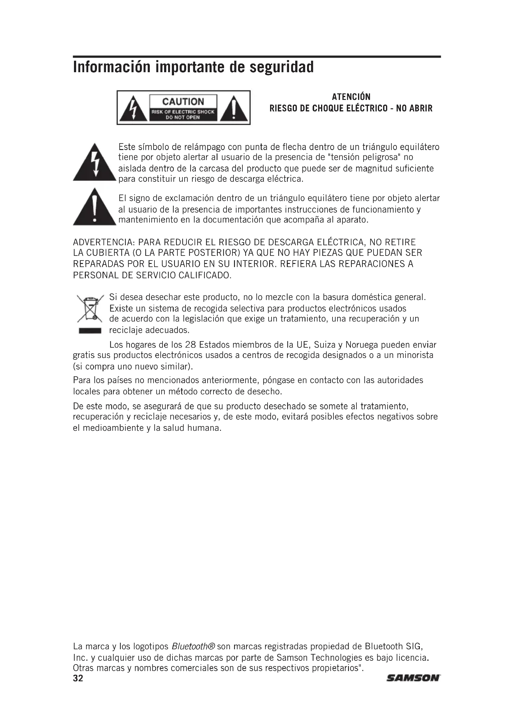 Información importante de seguridad ATENCIÓN RIESGO DE CHOQUE ELÉCTRICO - NO ABRIR Este símbolo de relámpago con punta de flecha dentro de un triángulo equilátero tiene por objeto alertar al usuario de la presencia de "tensión peligrosa" no aislada dentro de la carcasa del producto que puede ser de magnitud suficiente para constituir un riesgo de descarga eléctrica. El signo de exclamación dentro de un triángulo equilátero tiene por objeto alertar al usuario de la presencia de importantes instrucciones de funcionamiento y mantenimiento en la documentación que acompaña al aparato. ADVERTENCIA: PARA REDUCIR EL RIESGO DE DESCARGA ELÉCTRICA, NO RETIRE LA CUBIERTA (O LA PARTE POSTERIOR) YA QUE NO HAY PIEZAS QUE PUEDAN SER REPARADAS POR EL USUARIO EN SU INTERIOR. REFIERA LAS REPARACIONES A PERSONAL DE SERVICIO CALIFICADO. Si desea desechar este producto, no lo mezcle con la basura doméstica general. Existe un sistema de recogida selectiva para productos electrónicos usados de acuerdo con la legislación que exige un tratamiento, una recuperación y un reciclaje adecuados. Los hogares de los 28 Estados miembros de la UE, Suiza y Noruega pueden enviar gratis sus productos electrónicos usados a centros de recogida designados o a un minorista (si compra uno nuevo similar). Para los países no mencionados anteriormente, póngase en contacto con las autoridades locales para obtener un método correcto de desecho. De este modo, se asegurará de que su producto desechado se somete al tratamiento, recuperación y reciclaje necesarios y, de este modo, evitará posibles efectos negativos sobre el medioambiente y la salud humana. La marca y los logotipos Bluetooth® son marcas registradas propiedad de Bluetooth SIG, Inc. y cualquier uso de dichas marcas por parte de Samson Technologies es bajo licencia. Otras marcas y nombres comerciales son de sus respectivos propietarios".Expedition Escape+ - Sistemas PA portátiles 33 ENGLISH