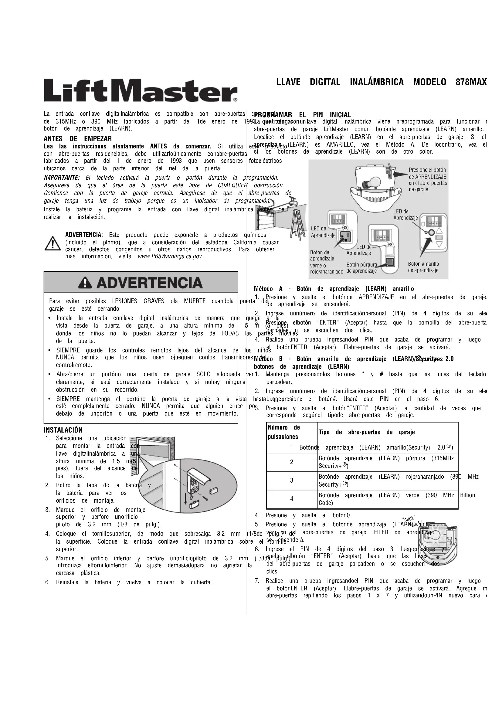 Consultez le revendeur ou un technicien radio/TV.LLAVE DIGITAL INALÁMBRICA MODELO 878MAX La entrada conllave digitalinalámbrica es compatible con abre-puertas de garaje de 315MHz o 390 MHz fabricados a partir del 1de enero de 1993 que tengan un botón de aprendizaje (LEARN).