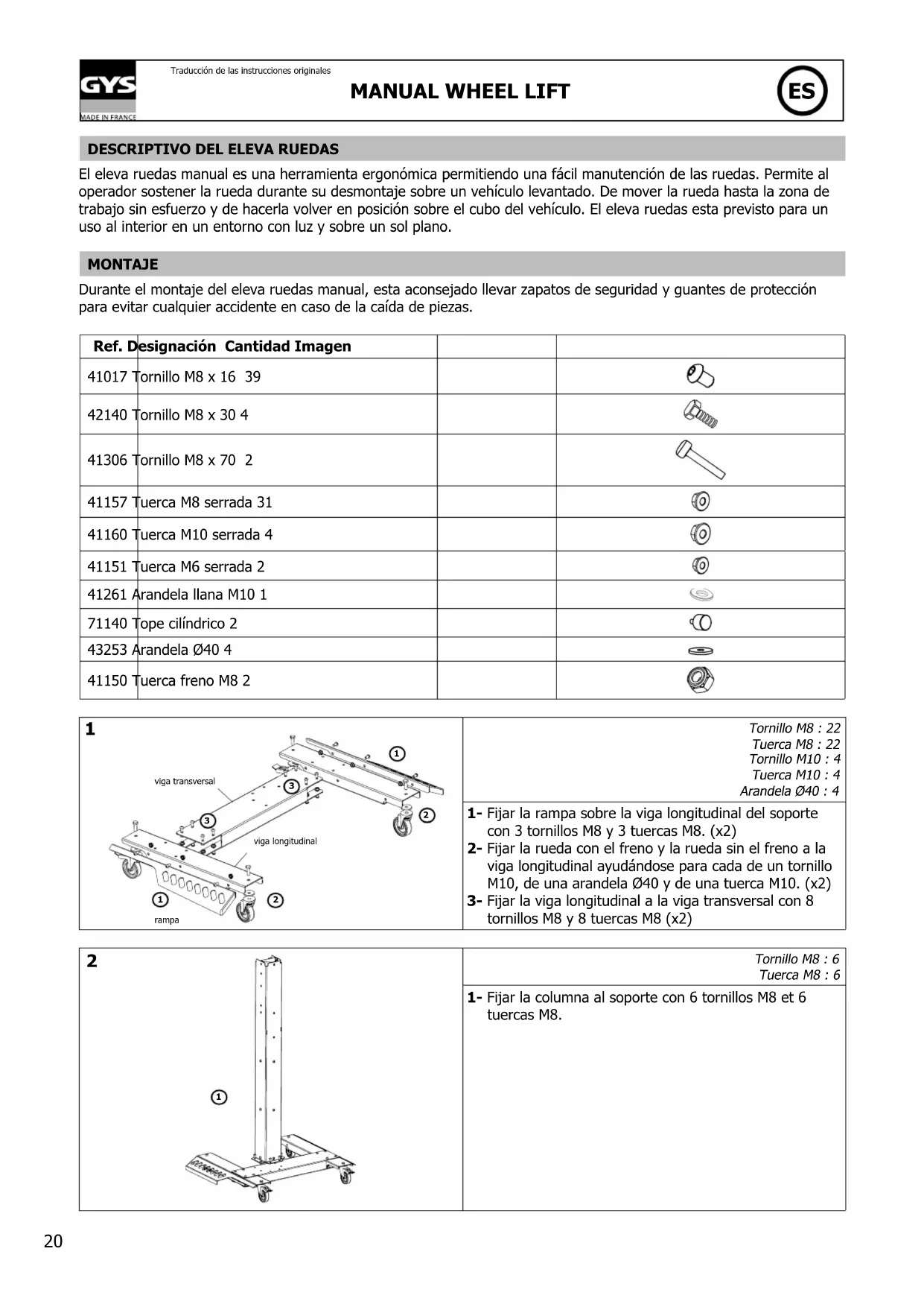 El eleva ruedas manual es una herramienta ergonómica permitiendo una fácil manutención de las ruedas. Permite al operador sostener la rueda durante su desmontaje sobre un vehículo levantado. De mover la rueda hasta la zona de trabajo sin esfuerzo y de hacerla volver en posición sobre el cubo del vehículo. El eleva ruedas esta previsto para un uso al interior en un entorno con luz y sobre un sol plano. MONTAJE Durante el montaje del eleva ruedas manual, esta aconsejado llevar zapatos de seguridad y guantes de protección para evitar cualquier accidente en caso de la caída de piezas. Ref. Designación Cantidad Imagen 41017 Tornillo M8 x 16 39 42140 Tornillo M8 x 30 4 41306 Tornillo M8 x 70 2 41157 Tuerca M8 serrada 31 41160 Tuerca M10 serrada 4 41151 Tuerca M6 serrada 2 41261 Arandela llana M10 1 71140 Tope cilíndrico 2 43253 Arandela Ø40 4 41150 Tuerca freno M8 2 rampaviga longitudinalviga transversal