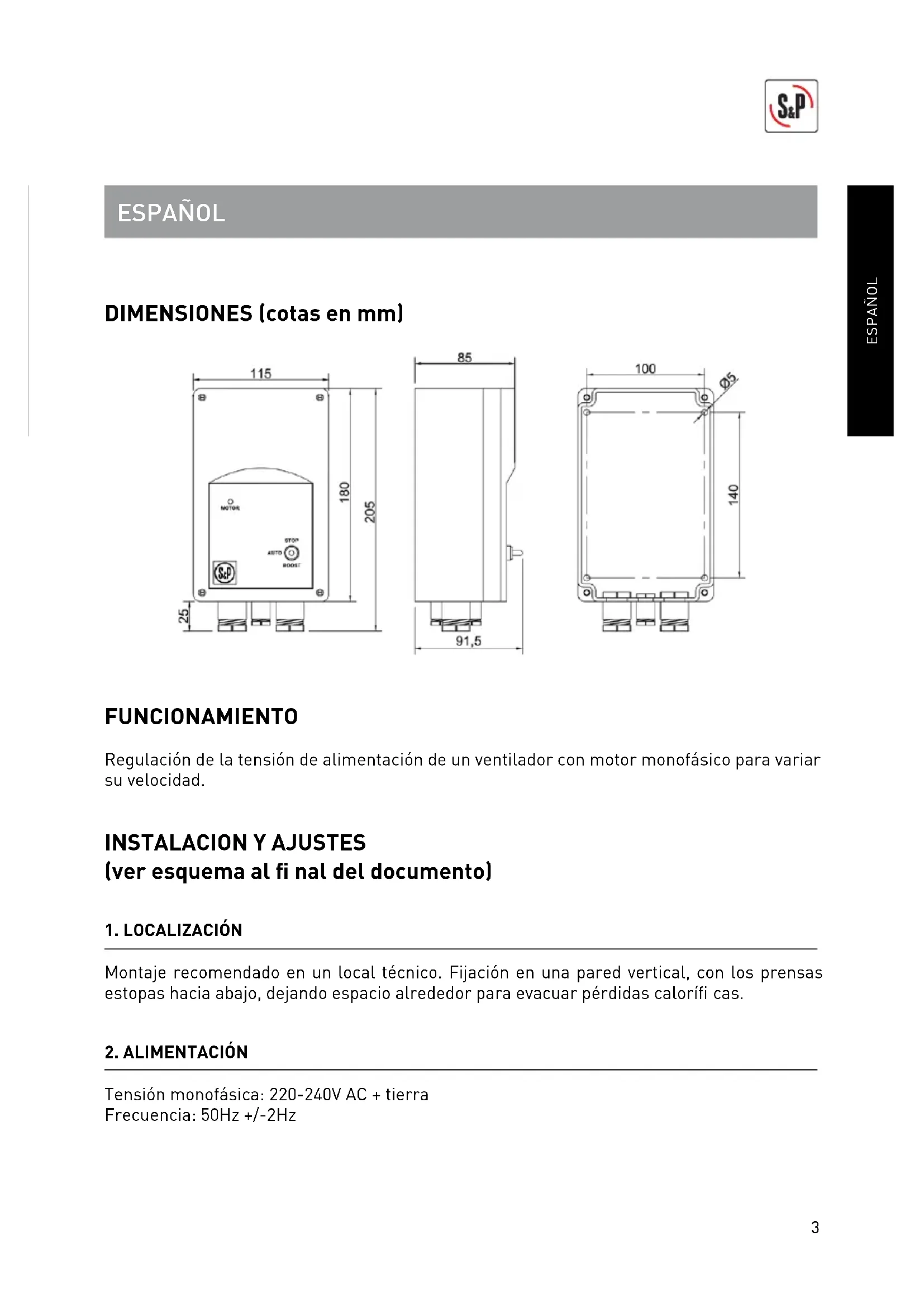 Tipo de regulador Intensidad max motor Fusible VAPZ-3 3A 5 x 20 mm 4A tipo F VAPZ-5 5A 5 x 20 mm 6.3A tipo F VAPZ-11 11A 6.3 x 32 mm 12.5A tipo F Protegido contra las sobretensiones; el fusible protege contra las sobrecargas y los corto- circuitos. Entrada analógicas protegida contre la inversión de polaridades Entradas aisladas galvani- camente de la potencia.77 ESPAÑOL Capacidad de conexión a los bornes: 1 a 2.5 mm². Clase de aislamiento eléctrico: 1. Caja: Índice de protección: IP55. Material: ABS V0. Color: RAL 7035. Suministrado con 4 prensaestopas: 2 x Pg7 + 2 x Pg11. Almacenamiento: -20°C a +60°C; Humedad relativa: 30 a 90%. Entorno de utilización: Temperatura: -10°C a +50°C. Humedad relativa: 30 a 95%. Mantenimiento: Ninguno; se aconseja comprobar regularmente el estado y el apreté de las conexiones y que la temperatura de ambiente se mantiene en los limites aceptados por el regulador. Conformidad a Normas: La declaración CE de conformidad es disponible. La conexión eléctrica tiene que realizarse conforme a las normas de seguridad vigente en cada país. Puntas de medida y potenciómetros para ajustar Emin, Emax, Smin y Smax De izquierda a derecha: interruptores de S1.1, S1.2 y S1.3 Alimentación 230V 50Hz Salida motor Salida relé Velocidad máx. Paro/ marcha Conectar la toma de tierra: La instalación tiene que ser protegida por un disyuntor magne- to-térmico correctamente dimensionado.88 RECOMENDACION! La puesta en marcha de este aparato, los ajustes y todas las interven- ciones tienen que ser realizadas por un profesional cualifi cado respectando las reglas, las normativas de instalación y los reglamentos de seguridad vigentes. Antes de poner bajo tensión, comprobar que la tensión de alimentación corresponde a los datos indicados en el producto: la conexión de una tensión diferente puede llevar a destruir el aparato. Desconectar la alimentación antes de cualquier intervención en el aparato. No tocar las partes bajo tensión. Existe un peligro de muerte. Una conexión eléctrica no conforme al es- quema dado en estas instrucciones y/o a las reglas de instalación vigente anula la garantía. ESPAÑOL99 ENGLISH DIMENSIONS (in mm) OPERATING PRINCIPLE By varying the supply voltage of the single-phase fan it is connected to, the controller changes the fan’s rotation speed (squirrel-cage single-phase asynchronous motor).