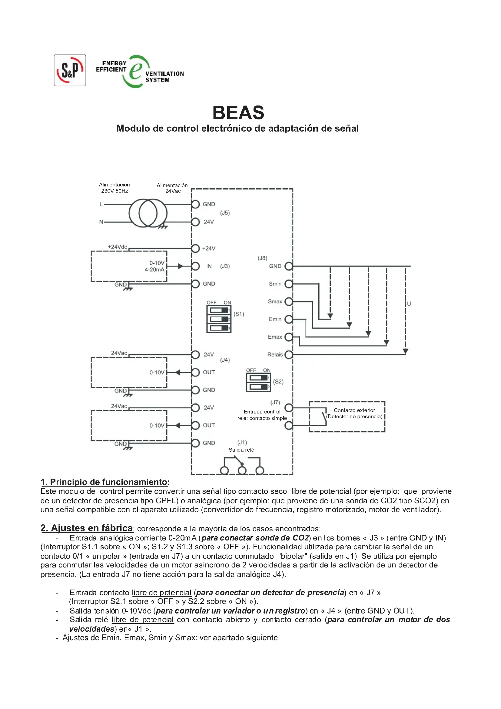 OTRAS NOTAS: Posicionamiento en la instalación: Montaje sea en un local tecnico, sea en falso techo / buhardillas. Dimensiones (L x H x P) en mm: 175 x 130 x 80. Alimentación (J5): 24V 50Hz. Consumo: 1.5W. Capacidad de conexión de los conectores suministrados: Conductores: conductores « flexible multifilar con terminales » o « rígido » de sección: 1 a 2.5mm². Características eléctricas del relé integrado (J1): Poder de corte de la corriente del contacto = 10A bajo 250Vac (cos fi = 0.6) / 16A bajo 250Vac (cos fi = 1). Salida 24V 50Hz (« J4 » entre GND y 24V): Corriente máx. disponible: 100mA Salida +24V (« J3 » entre GND y +24V): Corriente máx. disponible: 120mA Salida 0-10V (« J4 » entre GND y OUT): Corriente máx. disponible: 10mA Caja en plástico con clase de aislamiento eléctrico: 2. Índice de protección: IP55.Entorno de utilización: . Temperatura: -10°C a +50°C. . Húmeda relativa: máx. 95% sin condensación. Mantenimiento: sin. Conformidad a normas: la declaración CE de conformidad es disponible. La conexión eléctrica debe ser realizada en conformidad a las normas y reglamentos vigentes relativos a la seguridad de las personas. RECOMENDACION! La puesta en marcha de este aparato, los ajustes y todas las intervenciones tienen que ser realizadas por un profesional cualificado respetando las reglas, las normativas de instalación y los reglamentos de seguridad vigentes. Antes de poner bajo tensión, comprobar que la tensión de alimentación corresponde a los datos indicados en el producto: la conexión de una tensión diferente puede llevar a destruir el aparato. Desconectar la alimentación antes de cualquier intervención en el aparato. No tocar las partes bajo tensión. Existe un peligro de muerte. Una conexión eléctrica no conforme al esquema dado en estas instrucciones y/o a las reglas de instalación vigentes anula la garantía. S&P SISTEMAS DE VENTILACIÓN S.L.U. C/ Llevant, 408150 Parets del Vallès (Barcelona)Tel. +34 93 571 93 00Fax +34 93 571 93 01www.solerpalau.comPower supply230V 50HzPower supply24VacExternal contact(PIR detector)Input relay control simple contactOutput relay BEAS Electronic Signal Adapter Unit