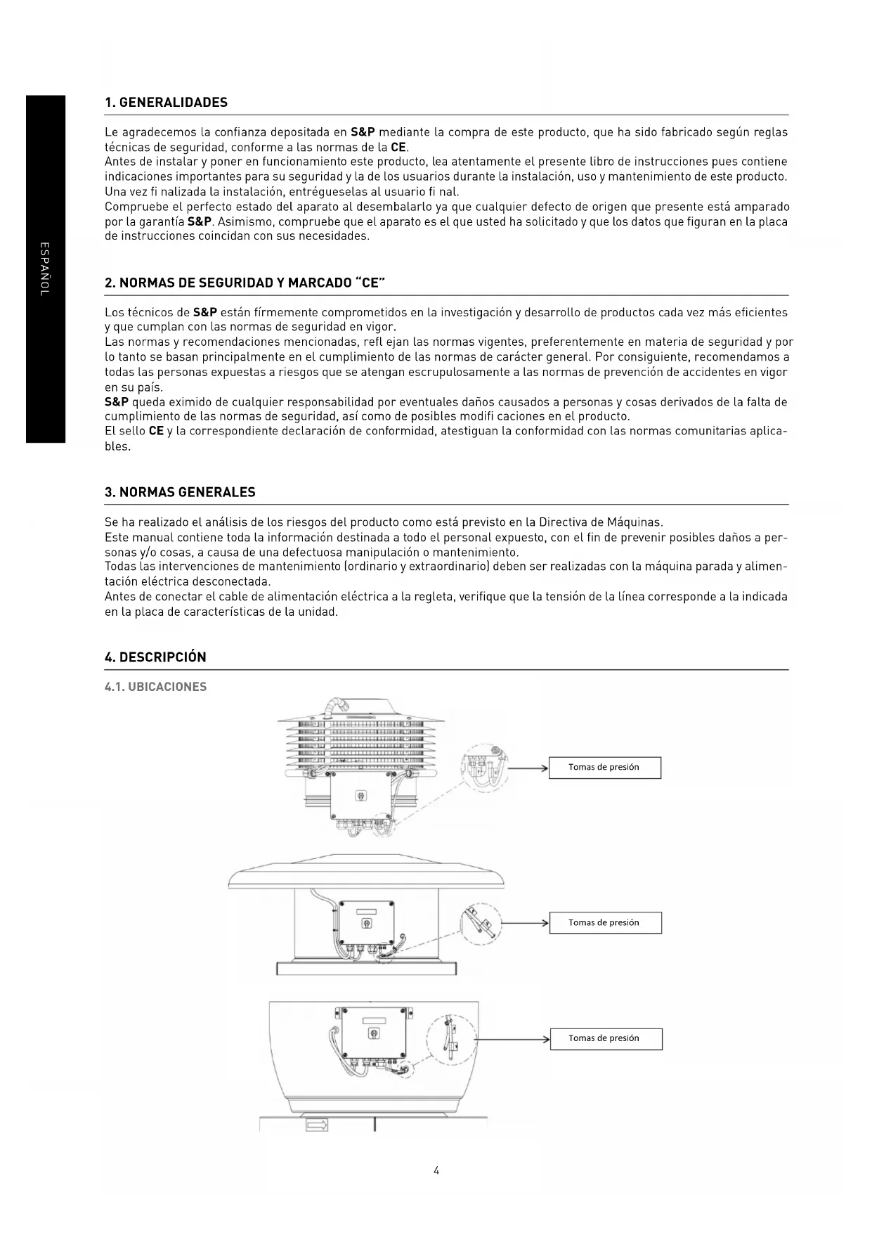 Le agradecemos la confi anza depositada en S&P mediante la compra de este producto, que ha sido fabricado según reglas técnicas de seguridad, conforme a las normas de la CE. Antes de instalar y poner en funcionamiento este producto, lea atentamente el presente libro de instrucciones pues contiene indicaciones importantes para su seguridad y la de los usuarios durante la instalación, uso y mantenimiento de este producto. Una vez fi nalizada la instalación, entrégueselas al usuario fi nal. Compruebe el perfecto estado del aparato al desembalarlo ya que cualquier defecto de origen que presente está amparado por la garantía S&P. Asimismo, compruebe que el aparato es el que usted ha solicitado y que los datos que fi guran en la placa de instrucciones coincidan con sus necesidades.