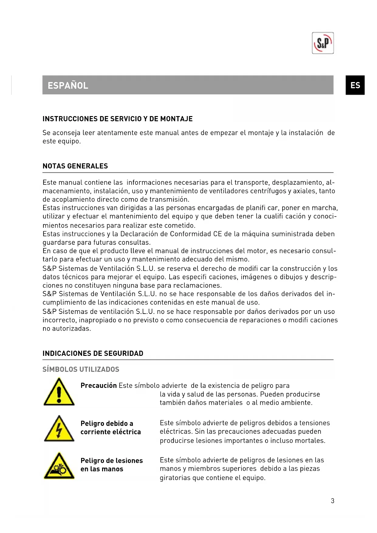 Se aconseja leer atentamente este manual antes de empezar el montaje y la instalación de este equipo. NOTAS GENERALES Este manual contiene las informaciones necesarias para el transporte, desplazamiento, al- macenamiento, instalación, uso y mantenimiento de ventiladores centrífugos y axiales, tanto de acoplamiento directo como de transmisión. Estas instrucciones van dirigidas a las personas encargadas de planifi car, poner en marcha, utilizar y efectuar el mantenimiento del equipo y que deben tener la cualifi cación y conoci- mientos necesarios para realizar este cometido. Estas instrucciones y la Declaración de Conformidad CE de la máquina suministrada deben guardarse para futuras consultas. En caso de que el producto lleve el manual de instrucciones del motor, es necesario consul- tarlo para efectuar un uso y mantenimiento adecuado del mismo. S&P Sistemas de Ventilación S.L.U. se reserva el derecho de modifi car la construcción y los datos técnicos para mejorar el equipo. Las especifi caciones, imágenes o dibujos y descrip- ciones no constituyen ninguna base para reclamaciones. S&P Sistemas de Ventilación S.L.U. no se hace responsable de los daños derivados del in- cumplimiento de las indicaciones contenidas en este manual de uso. S&P Sistemas de ventilación S.L.U. no se hace responsable por daños derivados por un uso incorrecto, inapropiado o no previsto o como consecuencia de reparaciones o modifi caciones no autorizadas.