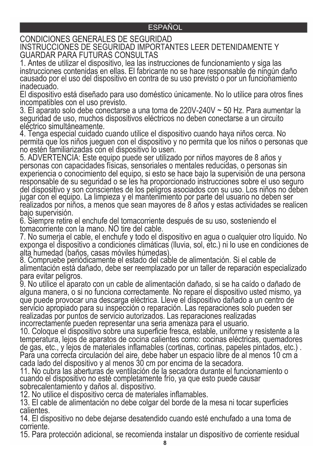 instrucciones contenidas en ellas. El fabricante no se hace responsable de ningún daño causado por el uso del dispositivo en contra de su uso previsto o por un funcionamiento inadecuado. El dispositivo está diseñado para uso doméstico únicamente. No lo utilice para otros fines incompatibles con el uso previsto.