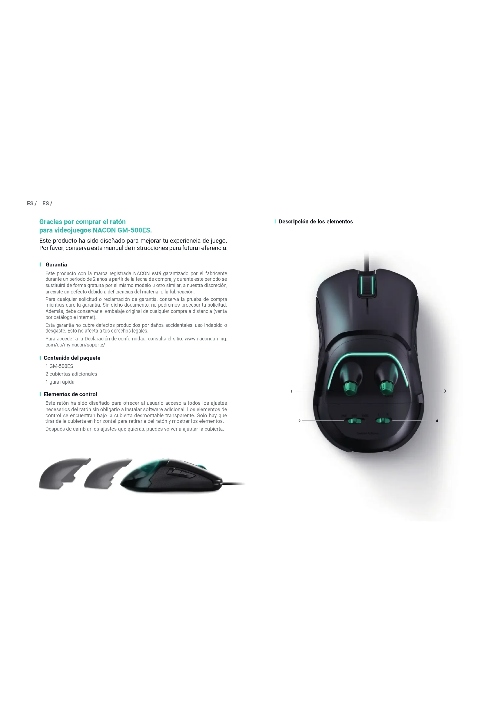 4ES / ES / 1 Cambiar la resolución La resolución del sensor del ratón determina la velocidad y precisión con que reacciona a los movimientos. Esta rueda se usa para modicar ese ajuste. Al girar la rueda, el efecto luminoso del ratón empezará a parpadear para indicar el cambio de resolución. Mientras esté parpadeando, el color de la luz indicará la resolución seleccionada. Amarillo: 400 PPP Morado: 600 PPP Azul: 800 dpi Verde: 1200 PPP Rojo: 2000 PPP Azul Claro: 4000 PPP Blanco: 5000 PPP Cuando hayas seleccionado la resolución deseada, las luces dejarán de parpadear a los 3 segundos. La retroiluminación recuperará el color original para indicar que el proceso de selección ha terminado. 2 Cambiar la tasa de refresco La tasa de refresco de un dispositivo USB determina la frecuencia con que el PC solicita una actualización de datos (en este caso, la posición del ratón y el estado de los botones) de un dispositivo conectado. La tasa de refresco de USB habitual es de 250 Hz, pero puedes aumentarla para superar las especicaciones del estándar USB. Las opciones son: - 250 Hz, paquete de datos USB enviado cada 4 ms (estándar USB) - 500 Hz, paquete de datos USB enviado cada 2 ms - 1000 Hz, paquete de datos USB enviado cada milisegundo 3 Cambiar el color del efecto luminoso Esta rueda te permite elegir el color de los efectos luminosos del ratón. 4 Alternar entre modo para zurdos/diestros El interruptor «L/R» activa los dos botones adicionales del lado izquierdo o derecho del ratón. Los botones no seleccionados se desactivan. I Cubiertas Este ratón incluye tres cubiertas en total. Estas cubiertas no solo protegen el compartimento que contiene los elementos de control, sino que presentan distintas formas y tamaños. Esto te permite adaptar el ratón hasta cierto punto al tamaño y la forma de tu mano. I Uso del ratón Este ratón es un dispositivo «plug & play», lo que signica que no necesita controladores adicionales. Solo tienes que conectarlo a un puerto USB libre y ¡a disfrutar! Reciclaje Este producto no debe desecharse junto a la basura doméstica normal. Por favor, llévalo a un punto de recogida adecuado. El reciclaje es importante y ayuda a proteger el medio ambiente reduciendo los residuos de los vertederos. - Para retirar el bloque trasero con facilidad, usa la muesca que hay a cada lado de la cubierta trasera. - Para volver a colocar el bloque trasero del ratón, ja la cubierta en la posición adecuada.ES / www.nacongaming.com @NacongamingES NacongamingES Nacon España I Precauciones importantes 1/ Esta unidad solo es apta para uso en interiores. No exponer a la luz directa o humedad. 2/ No exponer la unidad a salpicaduras, goteos. No sumergir en líquidos. 3/ No exponer al polvo, temperatura extrema, o golpes. 4/ No usar si el producto está dañado. No lo desarmes. 5/ Para la limpieza externa, usar exclusivamente un paño suave, limpio y húmedo. Los detergentes pueden dañar el acabado y ltrarse al interior. 6/ Nunca desplaces el producto tirando del cable. 7/ Este dispositivo no está diseñado para ser utilizado por alguien (niños incluidos) que tenga reducidas sus capacidades físicas, sensoriales o mentales, ni por alguien sin la experiencia o el conocimiento apropiados, a menos que haya recibido orientación anterior o instrucciones relativas al uso de este dispositivo por parte de personas responsables de su seguridad. Mantén este dispositivo fuera del alcance de los niños. I Ergonomía Mantener la mano en la misma posición mucho tiempo puede conllevar molestias y dolores. Si esto te ocurre con frecuencia, consulta a tu médico. Como precaución, recomendamos descansar 15 minutos cada hora. I Atención al cliente Para cualquier información, puede contactar con el servicio de atención al cliente. Para esto, le recomendamos que se asegure previamente de disponer de un máximo de información acerca del problema y el producto. Dirección electrónica: support.es@nacongaming.com Página web: www.nacongaming.com Dirección postal: Bigben Interactive - C/ Musgo 5, 2ª planta, 28023 Madrid, SpainIT / IT / Grazie per aver acquistato il Mouse da gaming NACON GM-500ES. Questo prodotto è pensato per migliorare l'esperienza videoludica. Conservare questo manuale di istruzioni per consultazioni future. I Garanzia Questo prodotto a marchio NACON è garantito dal produttore per 2 anni a partire dalla data d'acquisto. Durante questo periodo, in caso di difetti relativi alla lavorazione o al materiale, il prodotto verrà sostituito gratuitamente con un modello identico o simile, a nostra discrezione. Per qualsiasi richiesta di prestazioni in garanzia, conservare la prova d'acquisto per tutta la durata della garanzia stessa. Senza tale documento non sarà possibile prendere in carico la richiesta. Anche l'imballo originale deve essere conservato per tutti gli acquisti a distanza (VPC & Internet). Questa garanzia non copre difetti dovuti a danni accidentali, utilizzo improprio o normale usura e non modica i diritti di cui l'utente gode ai sensi di legge. Per accedere alla dichiarazione di conformità, si prega di visitare il sito: www.nacongaming.com/it/my-nacon/supporto/ I Contenuto della confezione 1 x GM-500ES 2 x Cover superiori aggiuntive 1 x Guida rapida I Comandi principali Questo mouse è stato progettato per consentire l'accesso a tutte le impostazioni principali del dispositivo senza dover installare un software aggiuntivo. I comandi per la modica delle impostazioni sono posizionati sotto la cover trasparente rimovibile. Per accedere ai comandi, è sufciente far scorrere la cover orizzontalmente per rimuoverla dal mouse. Una volta modicate le impostazioni, riposizionare la cover. I Descrizione dei comandi