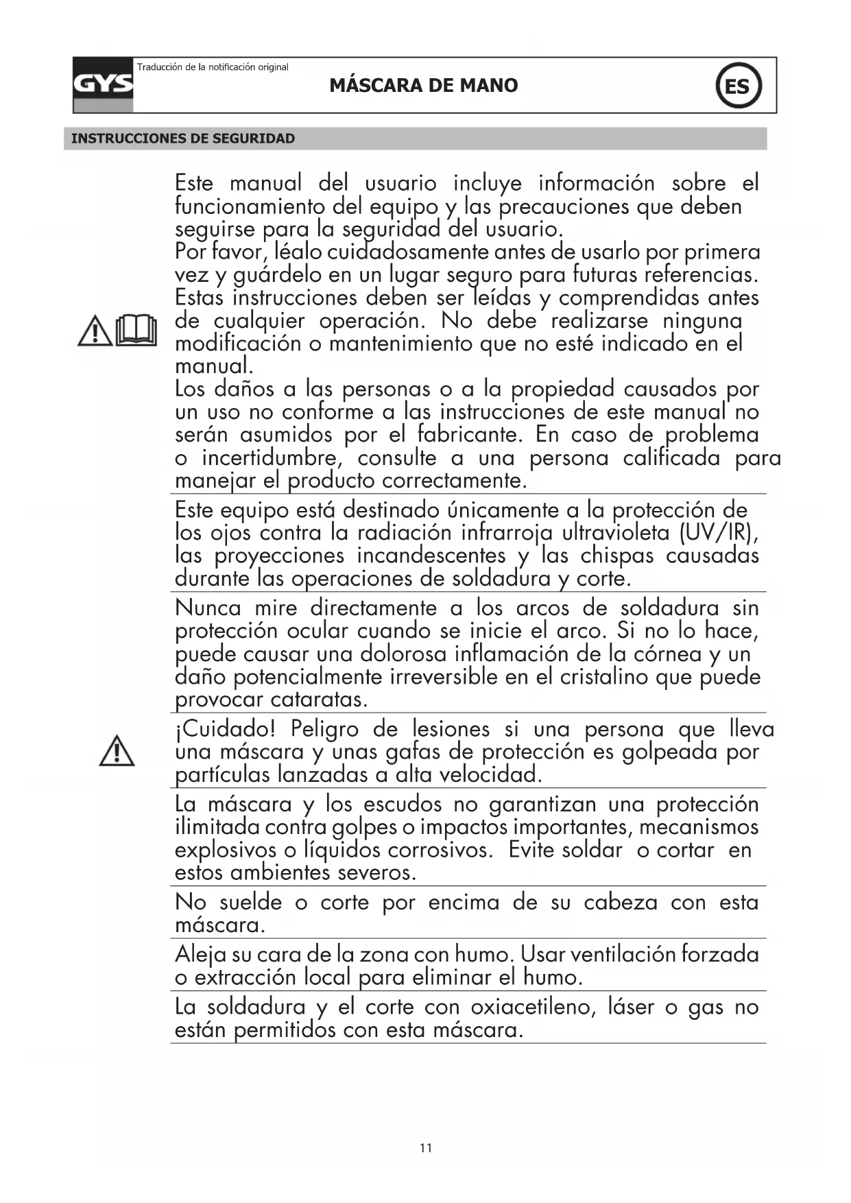 Este manual del usuario incluye información sobre el funcionamiento del equipo y las precauciones que deben seguirse para la seguridad del usuario. Por favor, léalo cuidadosamente antes de usarlo por primera vez y guárdelo en un lugar seguro para futuras referencias. Estas instrucciones deben ser leídas y comprendidas antes de cualquier operación. No debe realizarse ninguna modicación o mantenimiento que no esté indicado en el manual. Los daños a las personas o a la propiedad causados por un uso no conforme a las instrucciones de este manual no serán asumidos por el fabricante. En caso de problema o incertidumbre, consulte a una persona calicada para manejar el producto correctamente. Este equipo está destinado únicamente a la protección de los ojos contra la radiación infrarroja ultravioleta (UV/IR), las proyecciones incandescentes y las chispas causadas durante las operaciones de soldadura y corte. Nunca mire directamente a los arcos de soldadura sin protección ocular cuando se inicie el arco. Si no lo hace, puede causar una dolorosa inamación de la córnea y un daño potencialmente irreversible en el cristalino que puede provocar cataratas. ¡Cuidado! Peligro de lesiones si una persona que lleva una máscara y unas gafas de protección es golpeada por partículas lanzadas a alta velocidad. La máscara y los escudos no garantizan una protección ilimitada contra golpes o impactos importantes, mecanismos explosivos o líquidos corrosivos. Evite soldar o cortar en estos ambientes severos. No suelde o corte por encima de su cabeza con esta máscara. Aleja su cara de la zona con humo. Usar ventilación forzada o extracción local para eliminar el humo. La soldadura y el corte con oxiacetileno, láser o gas no están permitidos con esta máscara.12