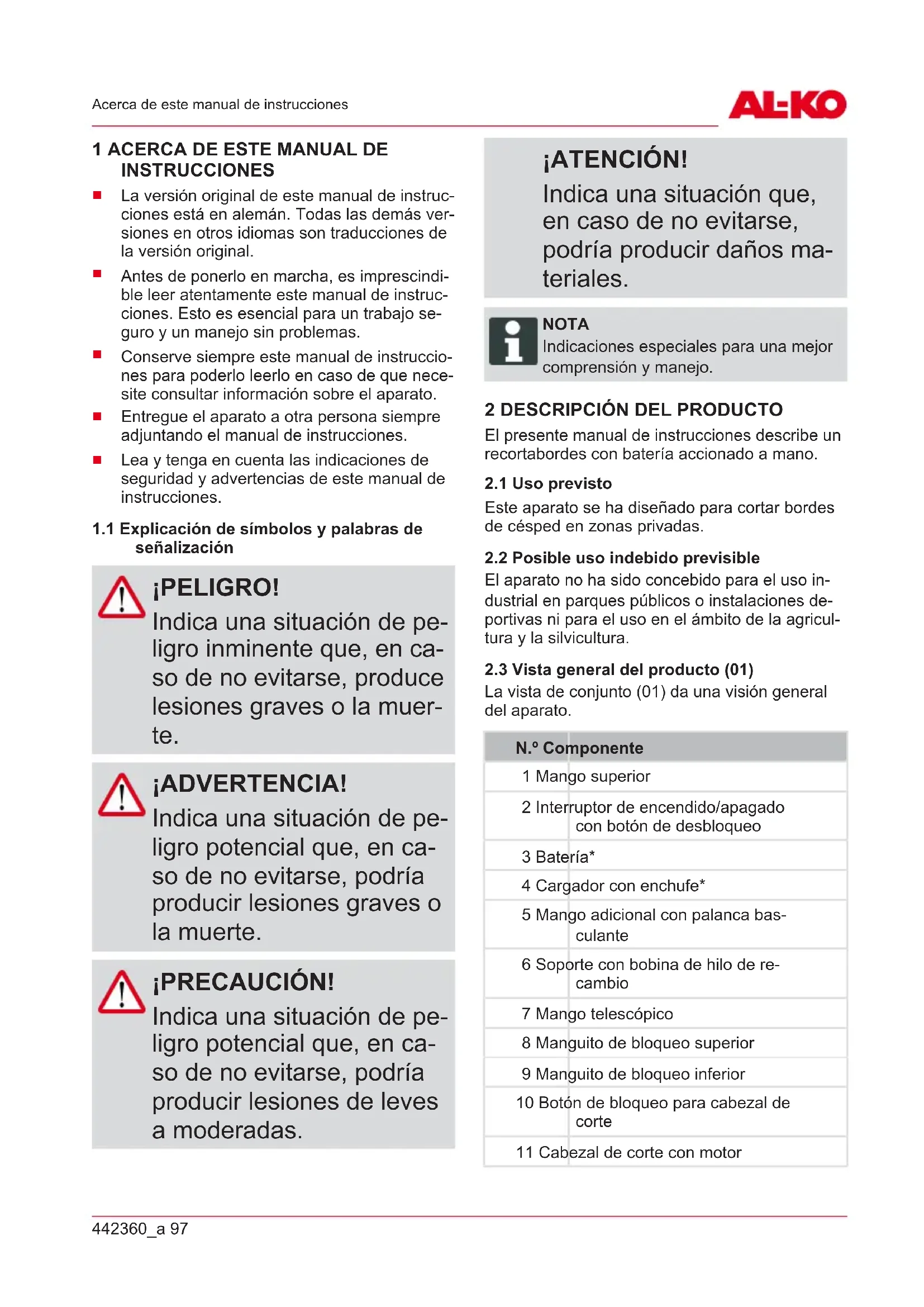 El presente manual de instrucciones describe un recortabordes con batería accionado a mano.