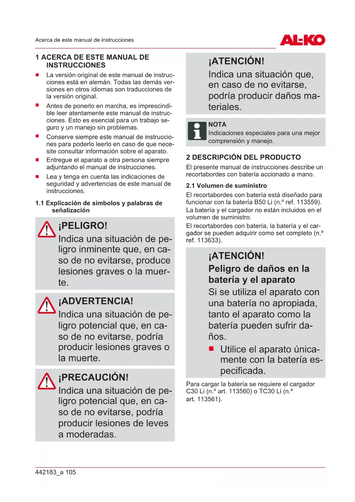 El recortabordes con batería está diseñado para funcionar con la batería B50 Li (n.º ref. 113559). La batería y el cargador no están incluidos en el volumen de suministro. El recortabordes con batería, la batería y el car- gador se pueden adquirir como set completo (n.º ref. 113633). ¡ATENCIÓN! Peligro de daños en la batería y el aparato Si se utiliza el aparato con una batería no apropiada, tanto el aparato como la batería pueden sufrir da- ños.