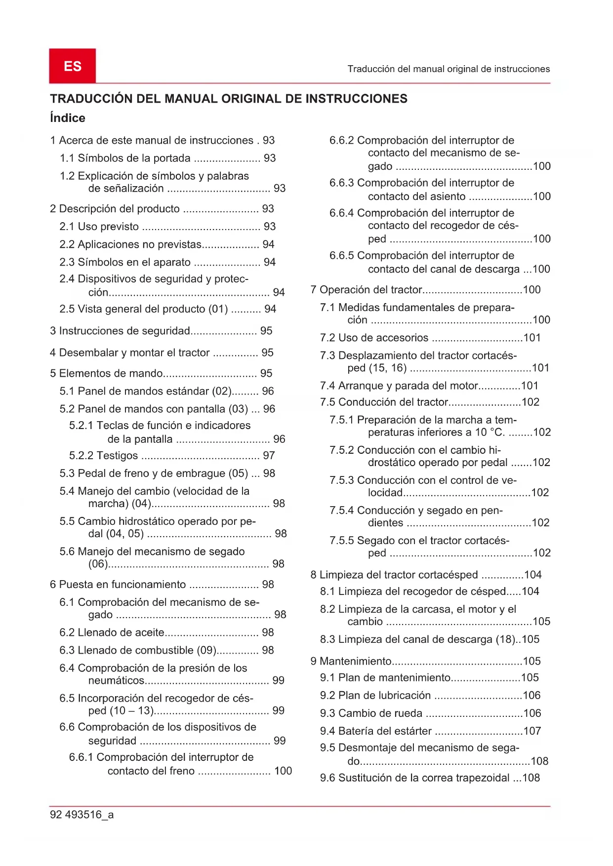 El tractor cortacésped está destinado al segado de jardines privados domésticos y recreativos con una pendiente máx. de 10° (18%). Otras aplicaciones adicionales, como, por ejemplo, la aplicación de mantillo, sólo se permiten si se utili- zan los accesorios originales y se respetan los valores de carga máximos. Este aparato ha sido diseñado únicamente para su uso privado. Se considerará uso no previsto cualquier otro uso diferente y las modificacionesES 94 493516_a Descripción del producto de montaje o ampliaciones no autorizadas. Como consecuencia, se excluirá la garantía, se perderá la conformidad (marcado CE) y también se anu- lará cualquier responsabilidad por parte del fabri- cante por daños al usuario o a terceros.