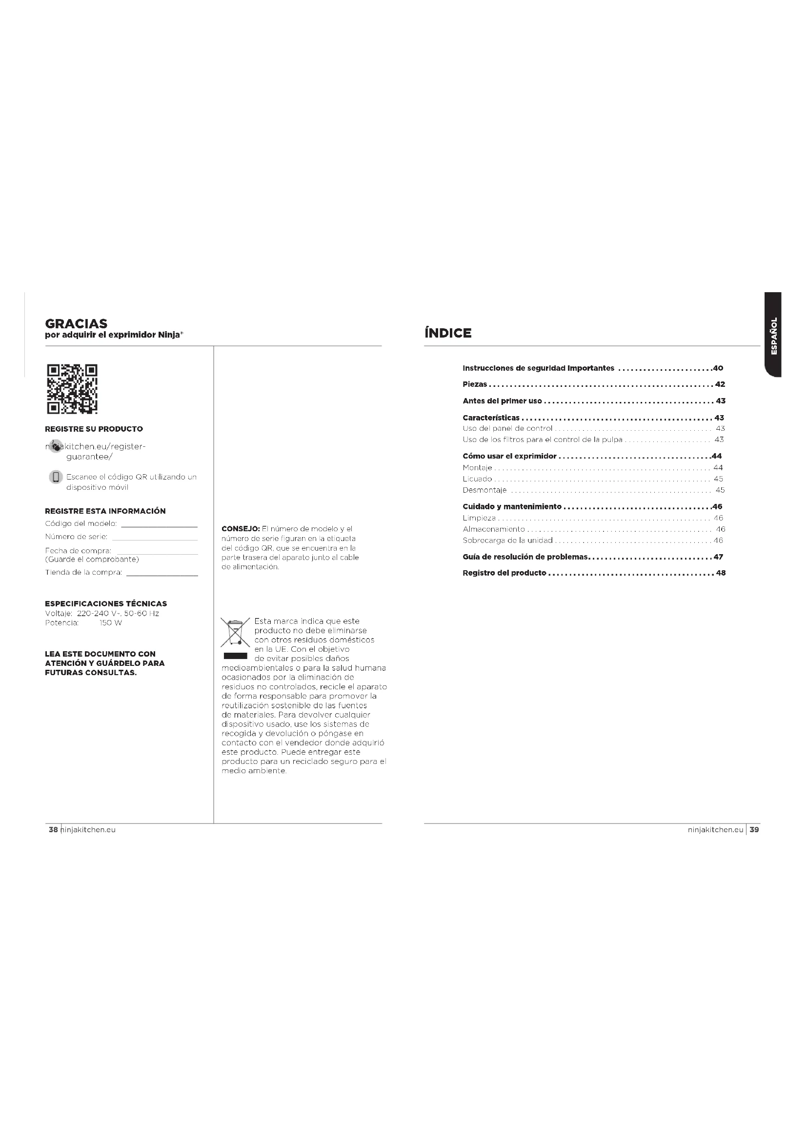 Voltaje: 220-240V~, 50-60Hz Potencia: 150W ESPAÑOL Esta marca indica que este producto no debe eliminarse con otros residuos domésticos en la UE. Con el objetivo de evitar posibles daños medioambientales o para la salud humana ocasionados por la eliminación de residuos no controlados, recicle el aparato de forma responsable para promover la reutilización sostenible de las fuentes de materiales. Para devolver cualquier dispositivo usado, use los sistemas de recogida y devolución o póngase en contacto con el vendedor donde adquirió este producto. Puede entregar este producto para un reciclado seguro para el medio ambiente.41 ninjakitchen.eu 40 ninjakitchen.eu